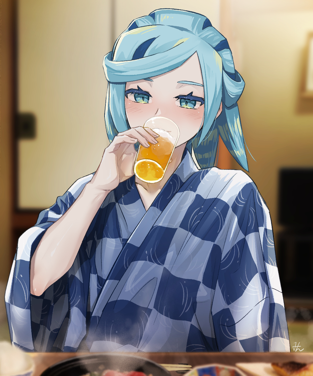 1boy alternate_costume aqua_eyes blue_hair blurry blush bowl commentary_request cup depth_of_field drinking glass grusha_(pokemon) half-closed_eyes hand_up highres holding holding_cup indoors japanese_clothes kimono long_hair male_focus min_(myna8247) nintendo pokemon pokemon_scarlet_and_violet signature solo steam table