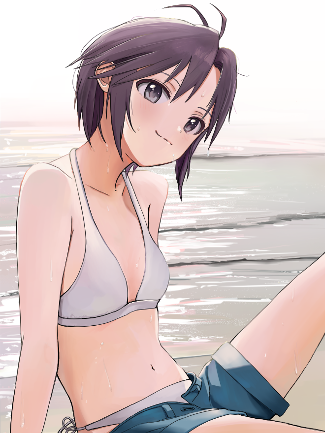 1girl :3 antenna_hair bikini black_hair denim denim_shorts dripping grey_eyes hashtag-only_commentary idolmaster idolmaster_(classic) kikuchi_makoto leaning_forward light_blush ocean outdoors parted_bangs ryuuboku_(stapler2355) shorts sitting solo swimsuit white_bikini