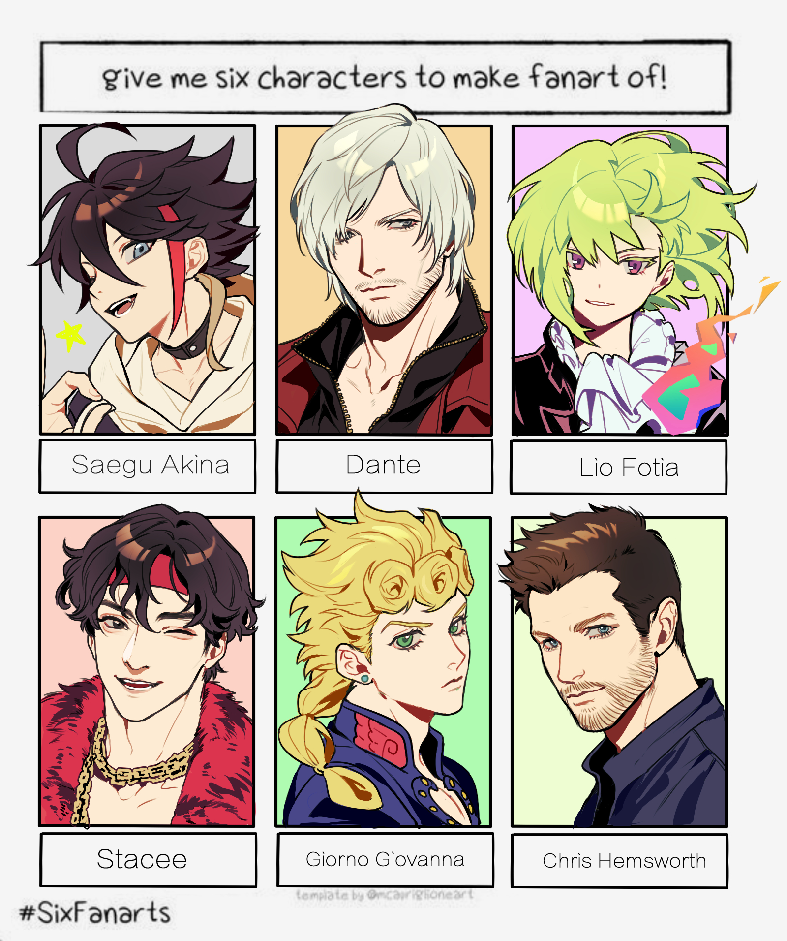 6+boys ahoge ascot black_hair blonde_hair braid character_name character_request choker chris_hemsworth dante_(devil_may_cry) devil_may_cry_(series) earrings eyelashes facial_hair fire followers_favorite_challenge giorno_giovanna green_eyes green_hair grey_hair highres jacket jewelry jojo_no_kimyou_na_bouken lio_fotia male_focus multicolored_hair multiple_boys multiple_drawing_challenge mustache nijisanji parted_lips promare purple_eyes qin_(7833198) real_life red_jacket saegusa_akina short_hair sparse_stubble streaked_hair vento_aureo virtual_youtuber white_ascot
