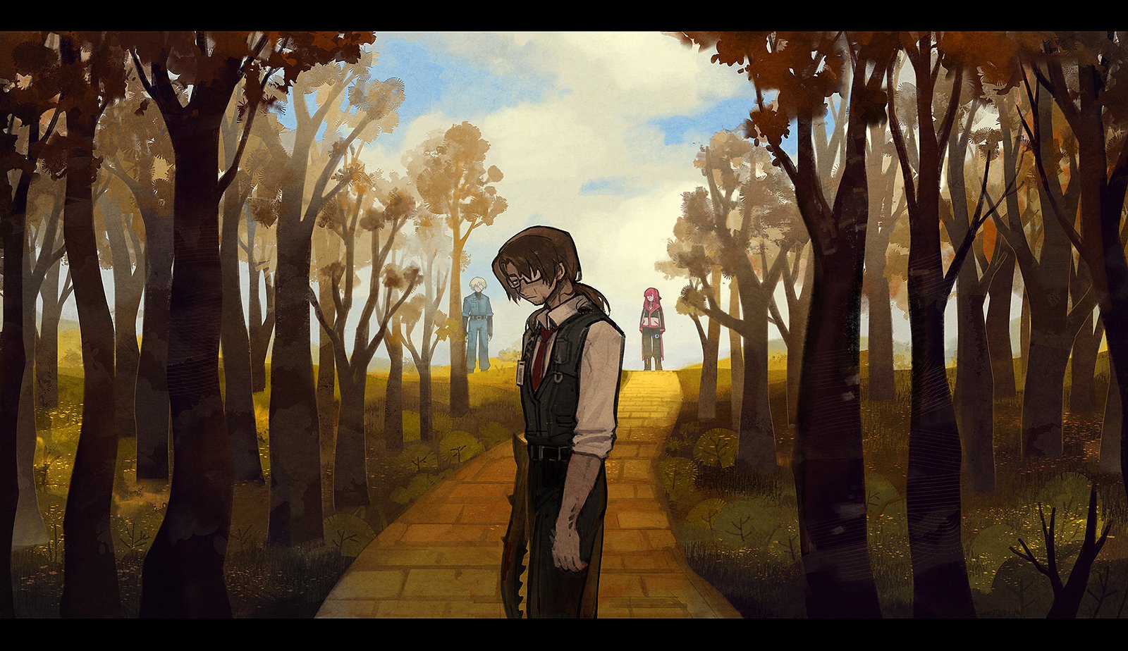 1girl 2boys black_pants black_vest brick_road brown_hair collared_shirt cowboy_shot flaw_eight forest glasses gregor_(project_moon) highres limbus_company long_hair looking_at_viewer low_ponytail multiple_boys nature necktie pants parted_bangs pink_hair ponytail project_moon red_necktie shirt tomah_(project_moon) tree vest white_shirt yuri_(project_moon)