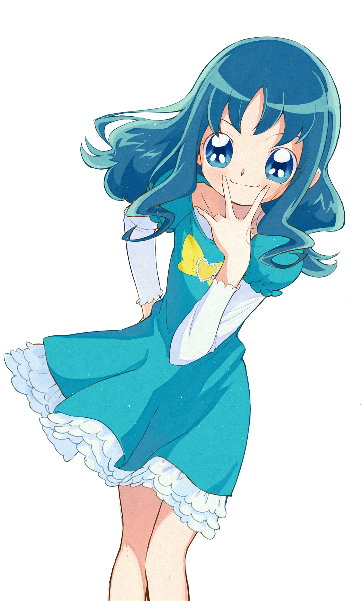 1girl aizawa_zawapo blue_eyes blue_hair blue_shirt blush bow closed_mouth collarbone commentary cowboy_shot dress dress_under_shirt frilled_dress frilled_sleeves frills hand_on_own_face hand_on_own_hip heartcatch_precure! highres kurumi_erika layered_sleeves legs_together long_hair long_sleeves looking_at_viewer official_style precure puffy_short_sleeves puffy_sleeves shirt shirt_bow short_dress short_sleeves simple_background smile solo standing umakoshi_yoshihiko_(style) wavy_hair white_background white_dress white_sleeves