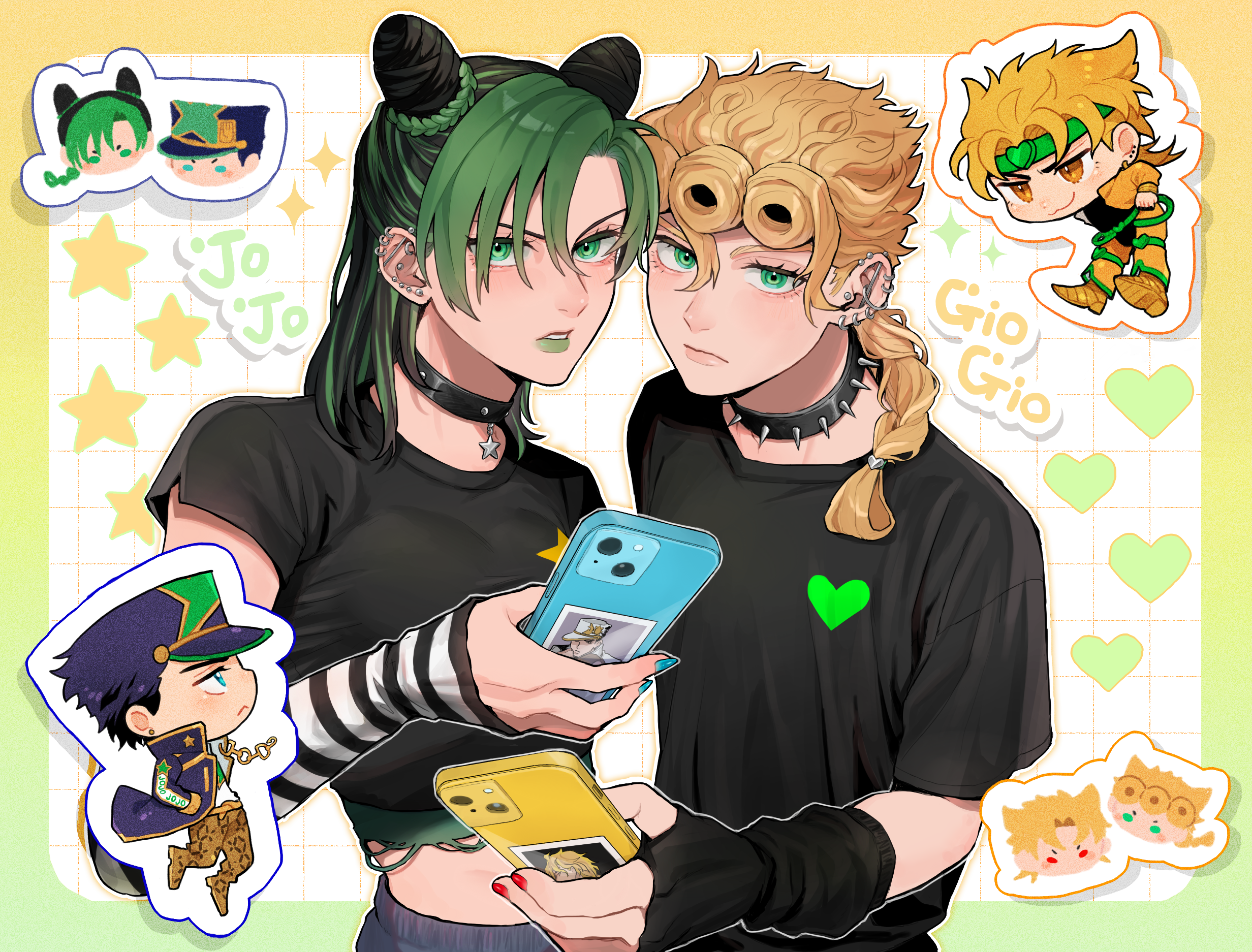 1girl 3boys :3 arm_warmers barbell_piercing black_arm_warmers black_hair black_shirt blonde_hair blue_nails blue_outline border brown_eyes cellphone chain character_name chibi chibi_inset collar crop_top dio_brando e-kid_fashion ear_piercing earrings english_text eyelashes father_and_child father_and_daughter father_and_son giorno_giovanna glowing green_eyes green_hair green_lips grid_background hat headband heart highres holding holding_phone industrial_piercing jacket jewelry jojo_no_kimyou_na_bouken komiya_harumoto kuujou_jolyne kuujou_joutarou leotard lipstick long_hair looking_at_another looking_at_viewer makeup medium_hair midriff multicolored_hair multiple_boys multiple_earrings orange_outline outline outside_border pants parent_and_child phone piercing purple_jacket red_eyes red_nails shirt short_hair smartphone spiked_collar spikes star_(symbol) stardust_crusaders sticker stone_ocean strap striped_arm_warmers t-shirt torn_clothes torn_shirt two-tone_hair vento_aureo white_arm_warmers white_outline white_shirt yellow_pants
