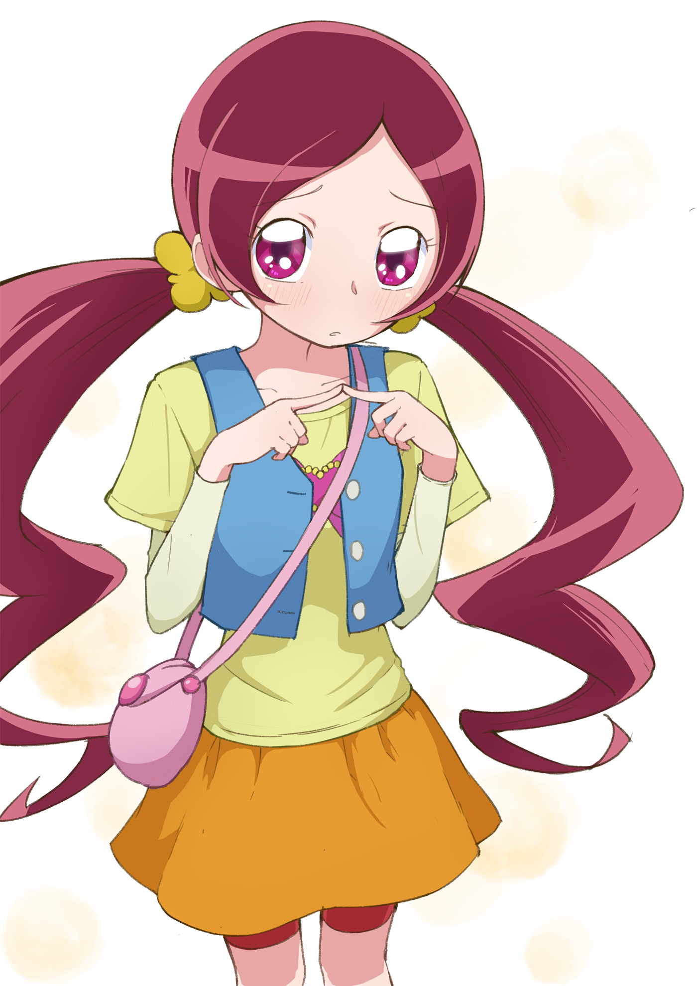 1girl aizawa_zawapo alternate_costume bag bike_shorts bike_shorts_under_skirt blue_vest blush bow casual collarbone commentary cowboy_shot flower furrowed_brow green_sleeves hair_flower hair_ornament hair_scrunchie hanasaki_tsubomi hands_up heartcatch_precure! highres index_fingers_together layered_sleeves long_hair long_sleeves looking_at_viewer low_twintails miniskirt official_style orange_skirt parted_bangs parted_lips pink_bag pink_bow pink_eyes pink_hair precure red_shorts scrunchie shirt short_sleeves shorts shoulder_bag skirt solo standing twintails umakoshi_yoshihiko_(style) very_long_hair vest white_background yellow_scrunchie yellow_shirt
