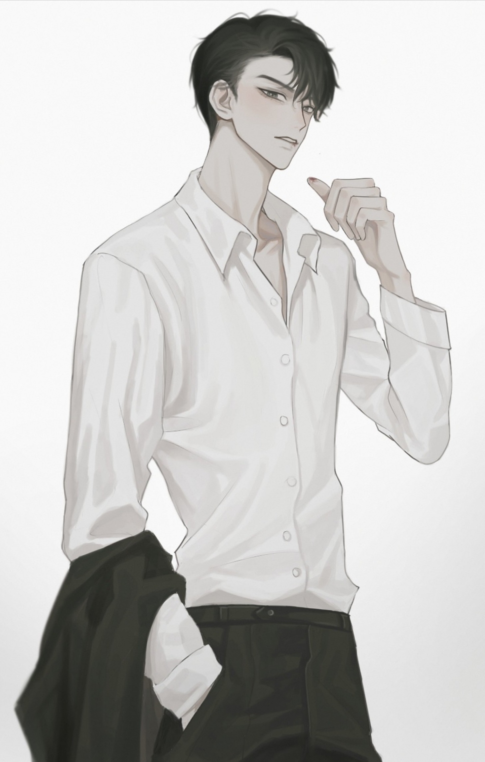 1boy belt black_belt black_hair black_jacket black_pants blood blood_on_face blood_on_hands brown_eyes chinese_commentary collarbone collared_shirt cowboy_shot dress_shirt hand_in_pocket hand_up highres holding holding_unworn_clothes in_love_with_an_idiot jacket jian_suiying long_sleeves looking_at_viewer male_focus open_collar pants parted_lips partially_unbuttoned shirt short_hair simple_background solo standing unworn_jacket wangongzhuovo white_background white_shirt