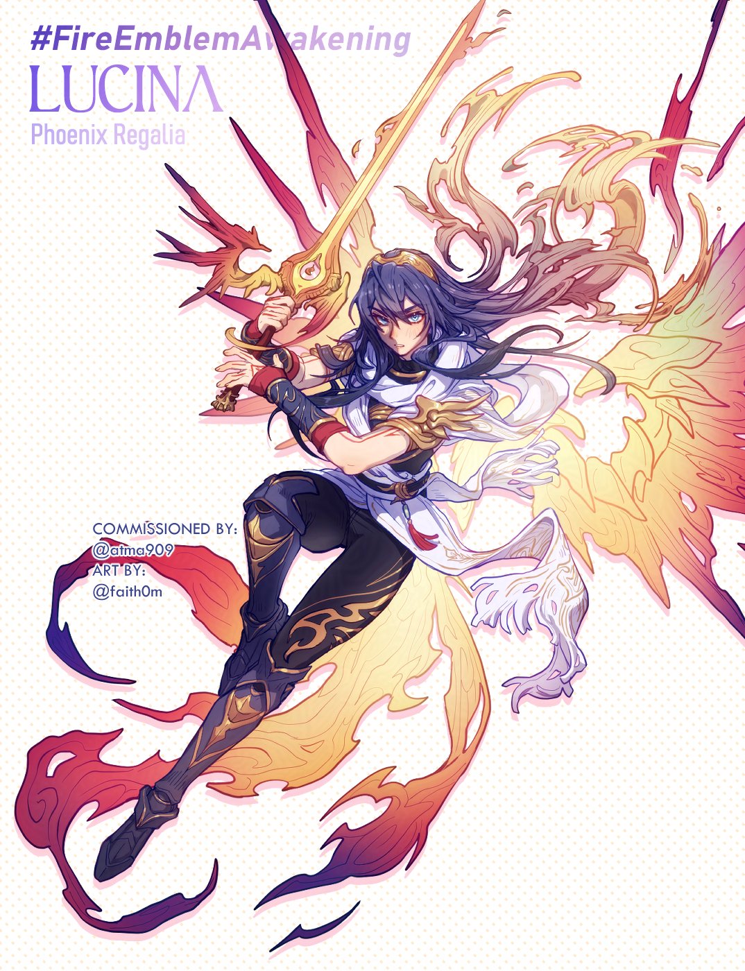 1girl alternate_costume arm_warmers armor armored_boots ben-day_dots black_pants blue_armor blue_eyes blue_hair boots character_name commentary commission commissioner_name copyright_name crossover dotted_background english_commentary english_text faithom falchion_(fire_emblem) fire_emblem fire_emblem_awakening floating full_body gradient_hair hair_between_eyes highres holding holding_sword holding_weapon leg_up long_hair looking_at_viewer lucina_(fire_emblem) marvel multicolored_hair nintendo pants parted_lips phoenix_force possessed possession screentones short_sleeves solo sword tassel tiara twitter_username vambraces waist_tassel weapon white_background x-men