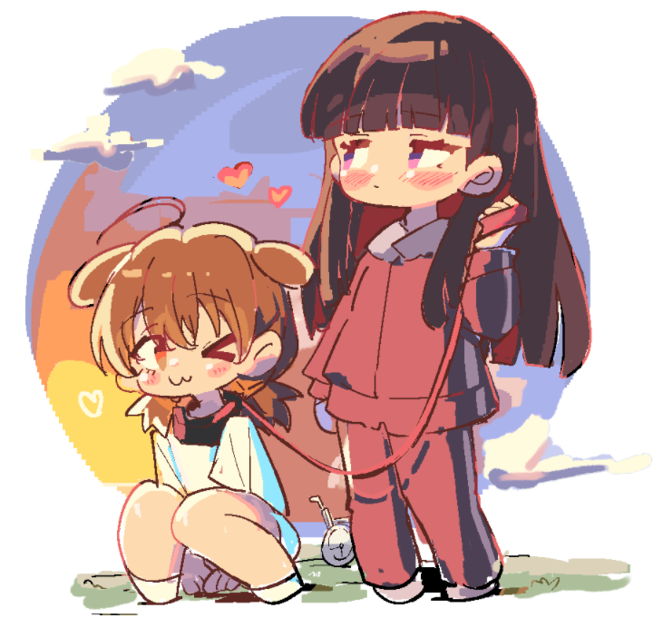 >_o 2girls :3 ahoge aieda_mari animal_ears artist_name black_hair brown_eyes brown_hair dog_ears holding holding_leash jacket leash long_hair misora_kanata multiple_girls na_nare_hana_nare one_eye_closed pants red_jacket red_pants red_track_suit shirt squatting standing sunset track_suit white_shirt yuri zhanzhangzlw