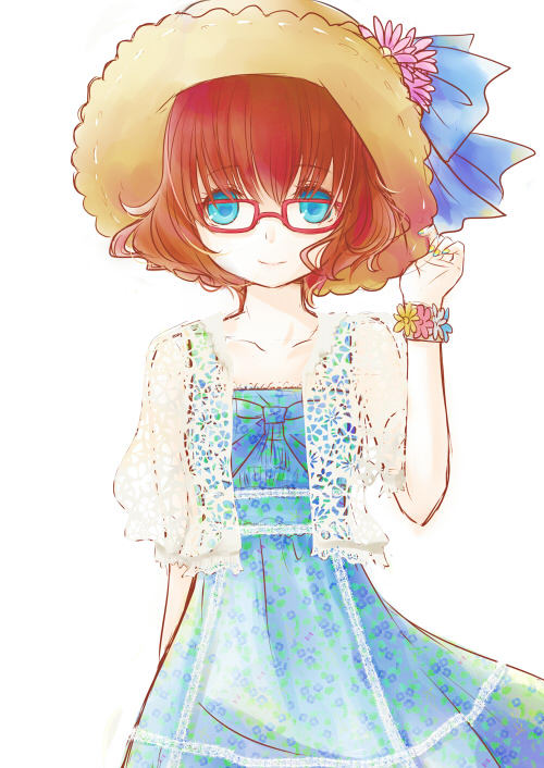 1girl blue_bow blue_dress blue_eyes bow brown_hair closed_mouth commentary_request cowboy_shot dress flower glasses hat hat_bow hat_flower lace_shirt looking_at_viewer original pink_flower red-framed_eyewear shirt simple_background smile solo sun_hat sundress white_background white_shirt yoru_nagatsuki