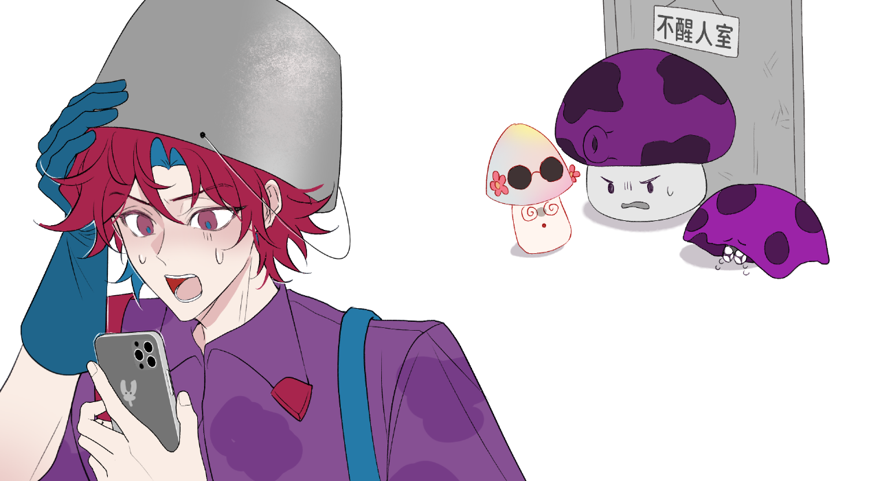 1boy :o @_@ blue_gloves blue_hair blue_pupils chinese_commentary chinese_text collared_shirt colored_inner_hair commentary_request door eyewear_on_head fingernails flower fume-shroom_(plants_vs._zombies) gloves grey_hat hand_on_own_head hat holding holding_phone hypno-shroom_(plants_vs._zombies) looking_at_phone magnet-shroom_(plants_vs._zombies) male_focus multicolored_hair mushroom open_mouth personification phone pink_eyes plants_vs._zombies purple_shirt red_flower red_hair rrtion scaredy-shroom_(plants_vs._zombies) shirt short_hair sign single_glove solo sunglasses suspenders sweat teeth tongue translation_request two-tone_hair upper_body v-shaped_eyebrows