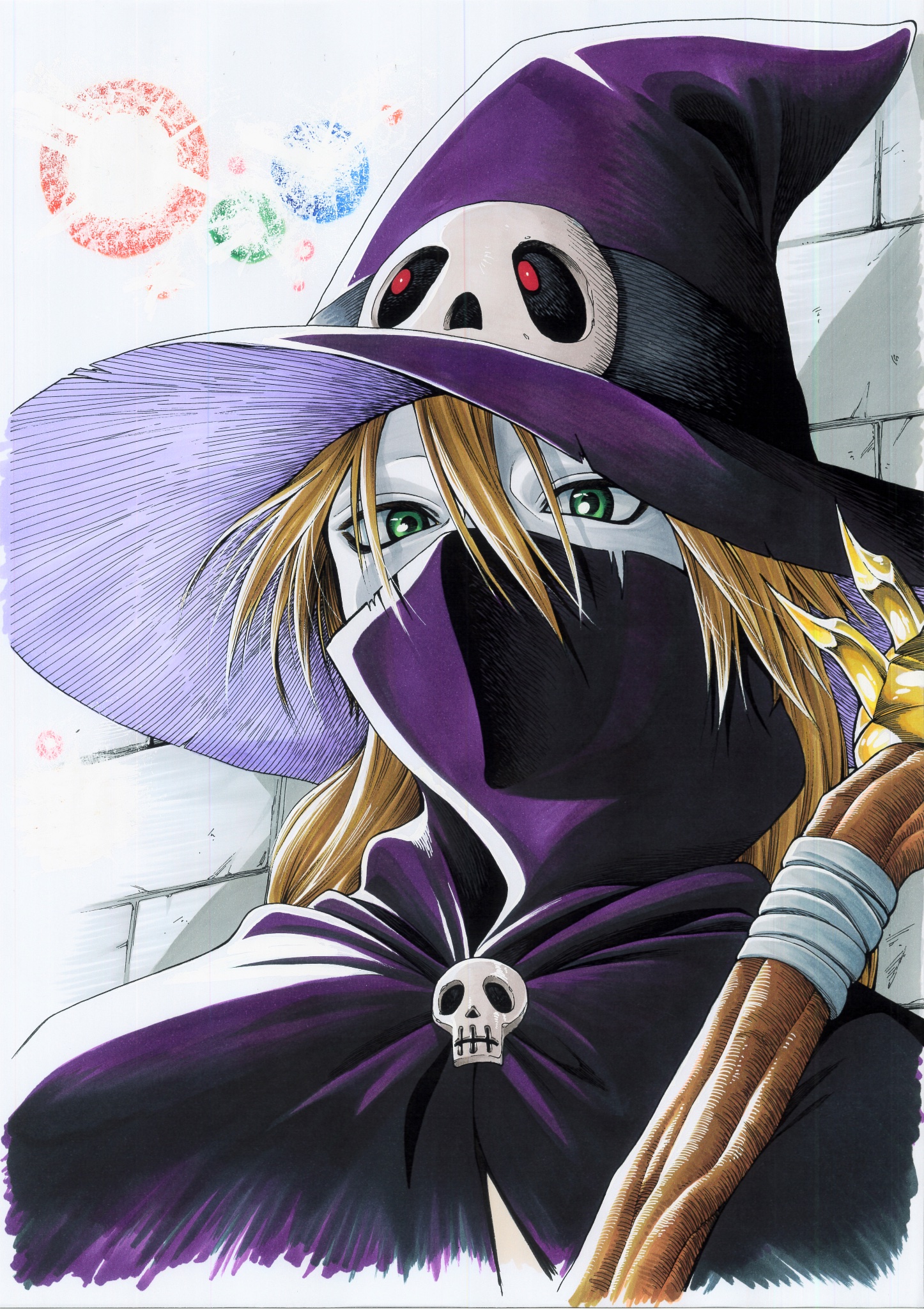 1boy blonde_hair blue_skin colored_skin covered_mouth digimon digimon_(creature) green_eyes hat highres long_hair male_focus miura_satoru solo staff upper_body wizard wizard_hat wizarmon