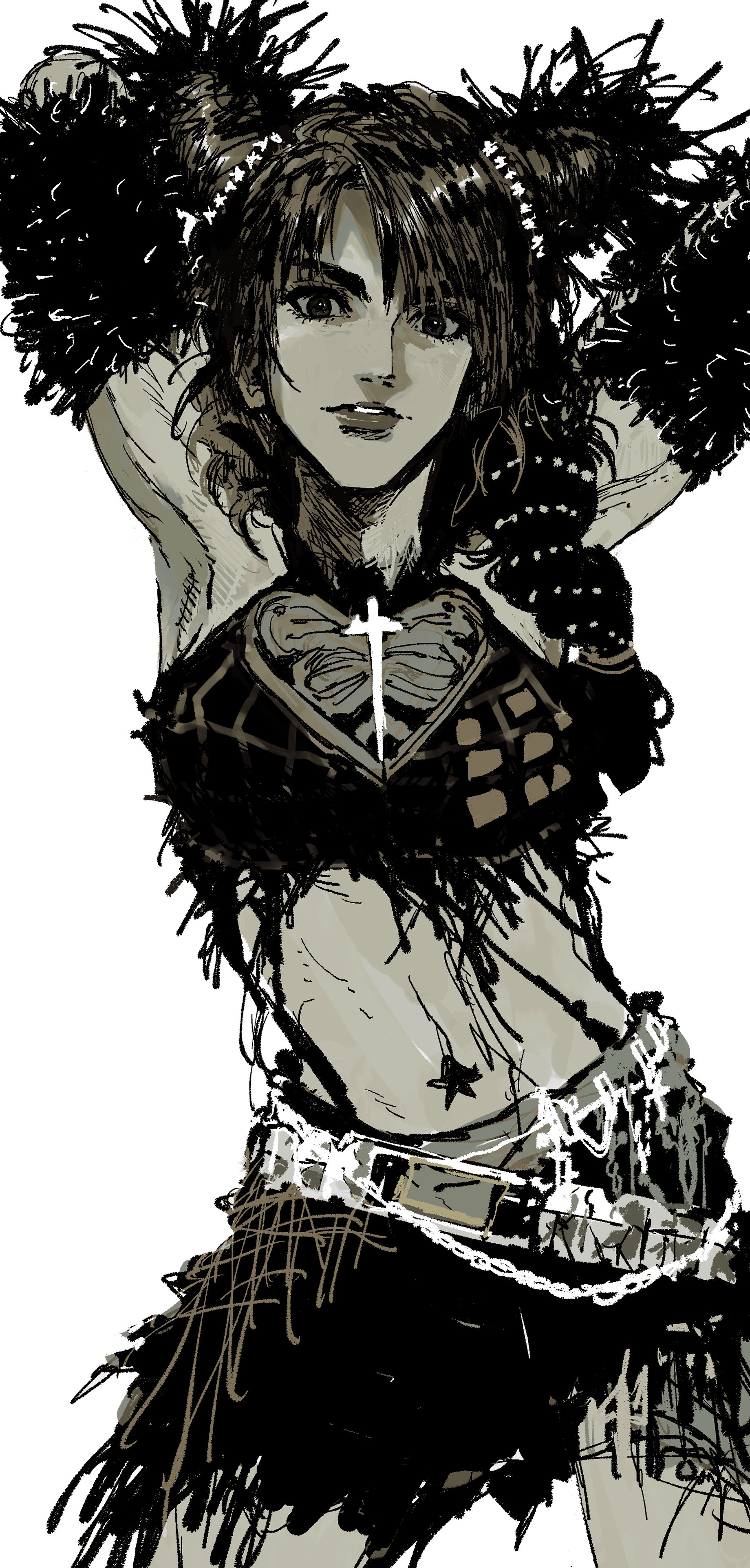 1girl absurdres arm_warmers armpits arms_behind_head arms_up belt braid cone_hair_bun cowboy_shot crop_top double_bun hair_bun highres jojo_no_kimyou_na_bouken kuujou_jolyne looking_at_viewer midriff monochrome my_nameisyoon navel navel_piercing piercing skirt solo stone_ocean white_background