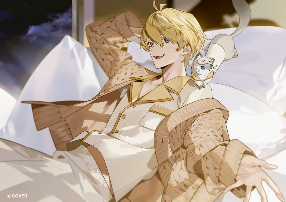 1boy :d animal animal_on_shoulder antenna_hair arm_behind_head beckoning blonde_hair blue_eyes blurry blurry_background cardigan clothed_animal copyright_notice cowboy_shot ferret hair_between_eyes hiyamaru holostars indoors kishido_temma long_sleeves looking_at_viewer male_focus midriff_peek night official_art on_bed open_cardigan open_clothes open_hand open_mouth pajamas pillow reclining shirt short_hair sleeves_past_wrists smile solo virtual_youtuber white_pajamas white_shirt window wing_collar yellow_cardigan yukko_(matakite_4kaku)