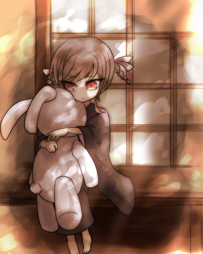 1girl aged_down black_kimono braid commentary_request danganronpa_(series) danganronpa_2:_goodbye_despair full_body grey_hair holding japanese_clothes kimono looking_down pekoyama_peko red_eyes ribbon short_hair shouji sitting sliding_doors solo stuffed_animal stuffed_toy twin_braids twintails white_ribbon zi_huahuo