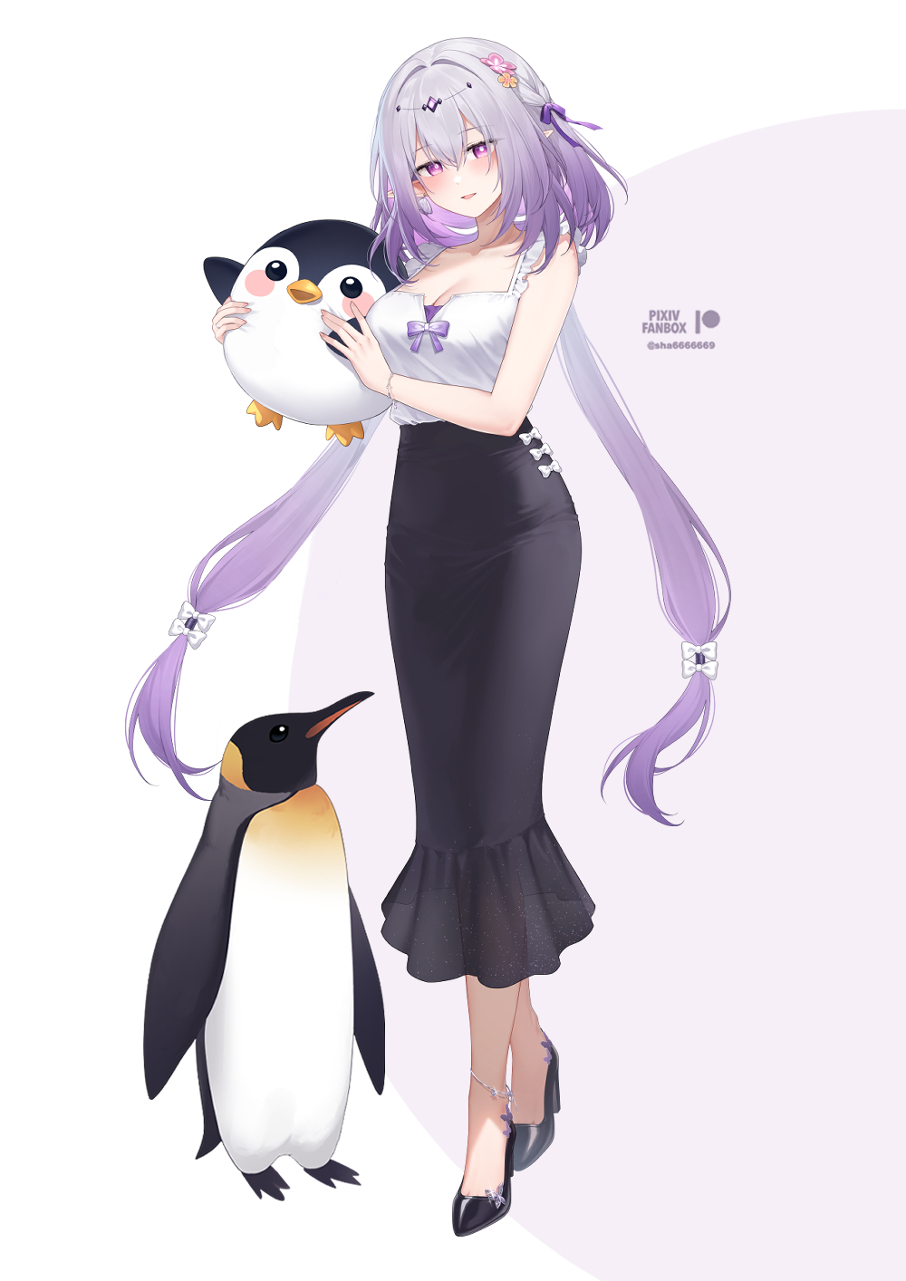 1girl alternate_costume bird black_shoes black_skirt bow breasts castorice_(honkai:_star_rail) chest_bow cleavage commentary_request flower full_body hair_bow hair_flower hair_ornament highres honkai:_star_rail honkai_(series) long_hair looking_at_viewer low-tied_long_hair multiple_hair_bows paid_reward_available parted_lips penguin pointy_ears purple_bow purple_eyes purple_hair shirt shoes shrimp_cake skirt sleeveless sleeveless_shirt solo standing stuffed_animal stuffed_penguin stuffed_toy twintails white_bow white_shirt