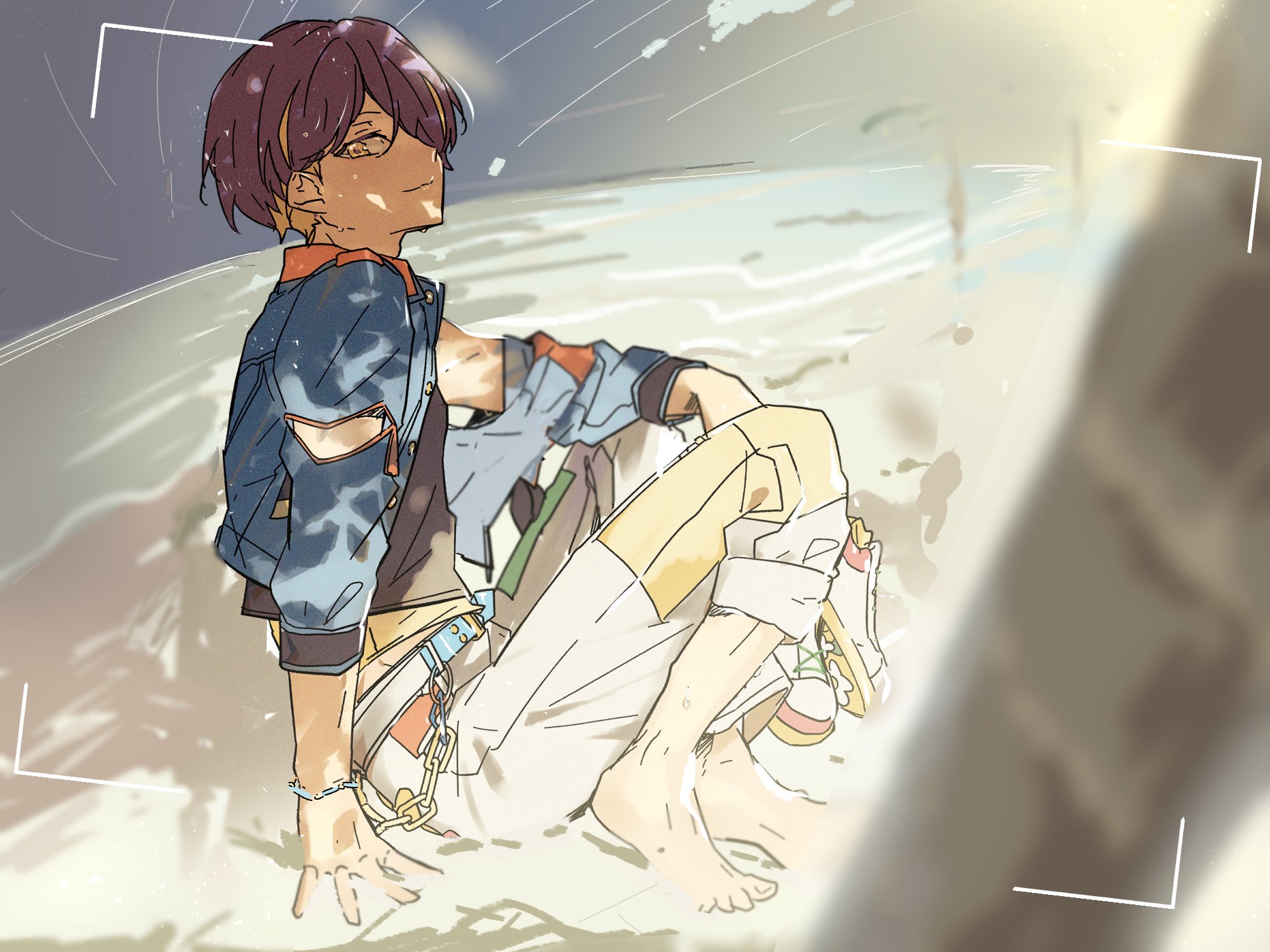 1boy arm_cutout arm_on_knee barefoot beach black_shirt blonde_hair blue_jacket blurry blurry_foreground capri_pants chain chain_bracelet closed_mouth clothing_cutout cloud collared_jacket cropped_jacket dappled_sunlight ensemble_stars! groin hair_over_one_eye highres holding holding_shoes holding_unworn_clothes jacket knees_up looking_at_viewer male_focus multicolored_hair off_shoulder official_alternate_costume on_ground one_eye_covered or_i palm_tree pants purple_hair sand sengoku_shinobu shadow shirt shoes shore short_hair short_sleeves sitting sky smile sneakers solo streaked_hair sunlight tree unworn_shoes viewfinder wet white_pants white_shoes yellow_eyes zipper zipper_pull_tab