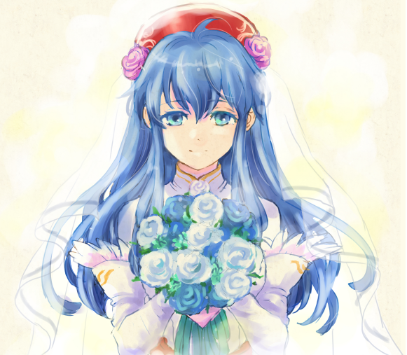 1girl blue_eyes blue_flower blue_hair blue_rose bouquet bridal_veil dress elbow_gloves fire_emblem fire_emblem:_the_binding_blade fire_emblem_heroes flower gloves hair_flower hair_ornament holding holding_bouquet lilina_(bridal)_(fire_emblem) lilina_(fire_emblem) long_hair looking_at_viewer nintendo rose smile upper_body usachu_now veil wedding_dress white_flower white_rose