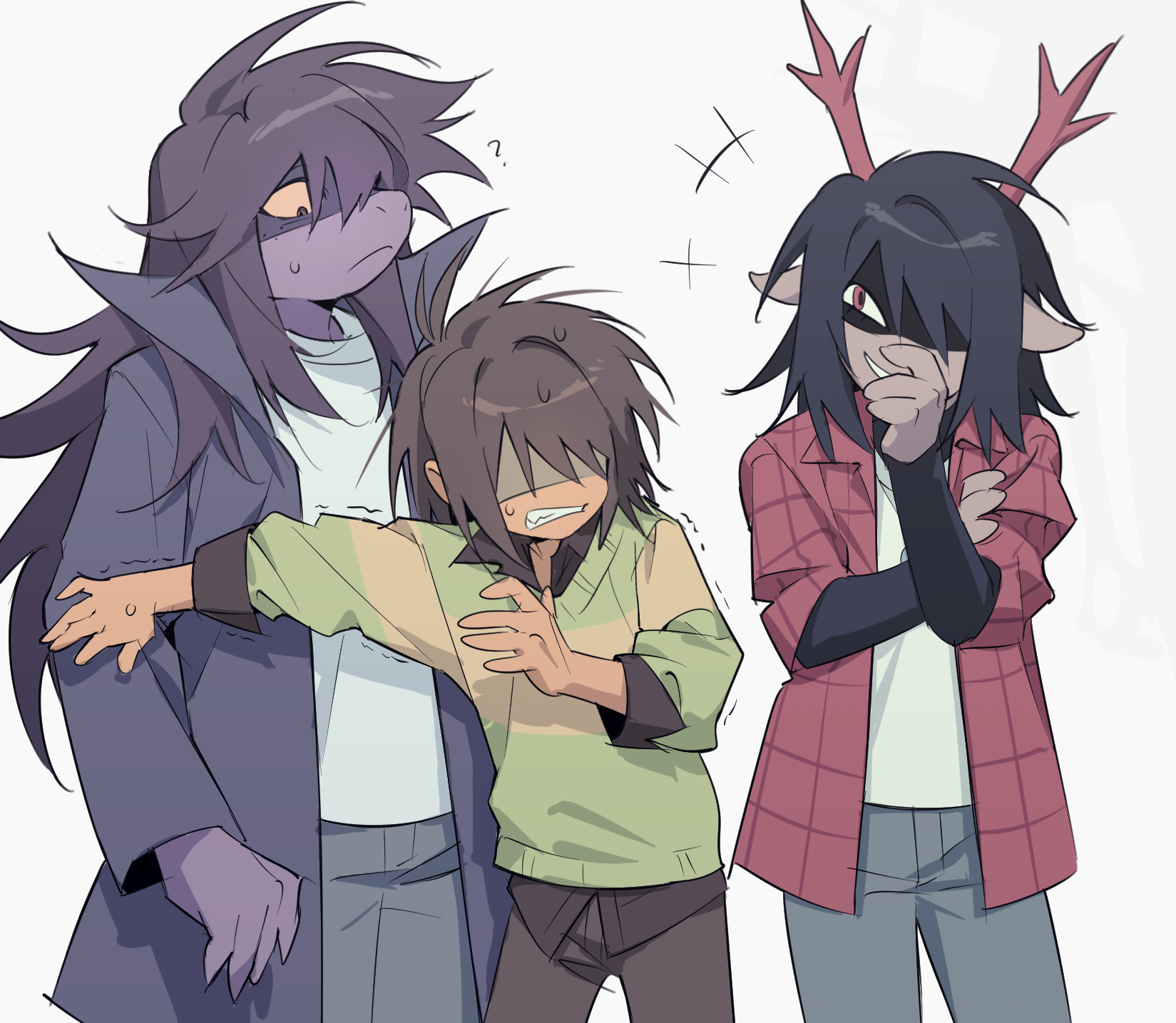 1boy 2girls blue_pants brown_hair brown_pants brown_shirt clenched_teeth collared_shirt december_holiday deer_girl deltarune denim design_speculation flannel green_sweater highres jacket jeans kris_(deltarune) long_hair long_sleeves multiple_girls pants purple_hair purple_jacket red_jacket sanbel780308 shirt short_hair sidelocks simple_background susie_(deltarune) sweat sweater teeth utdr_(toby_fox) very_long_hair white_background white_shirt