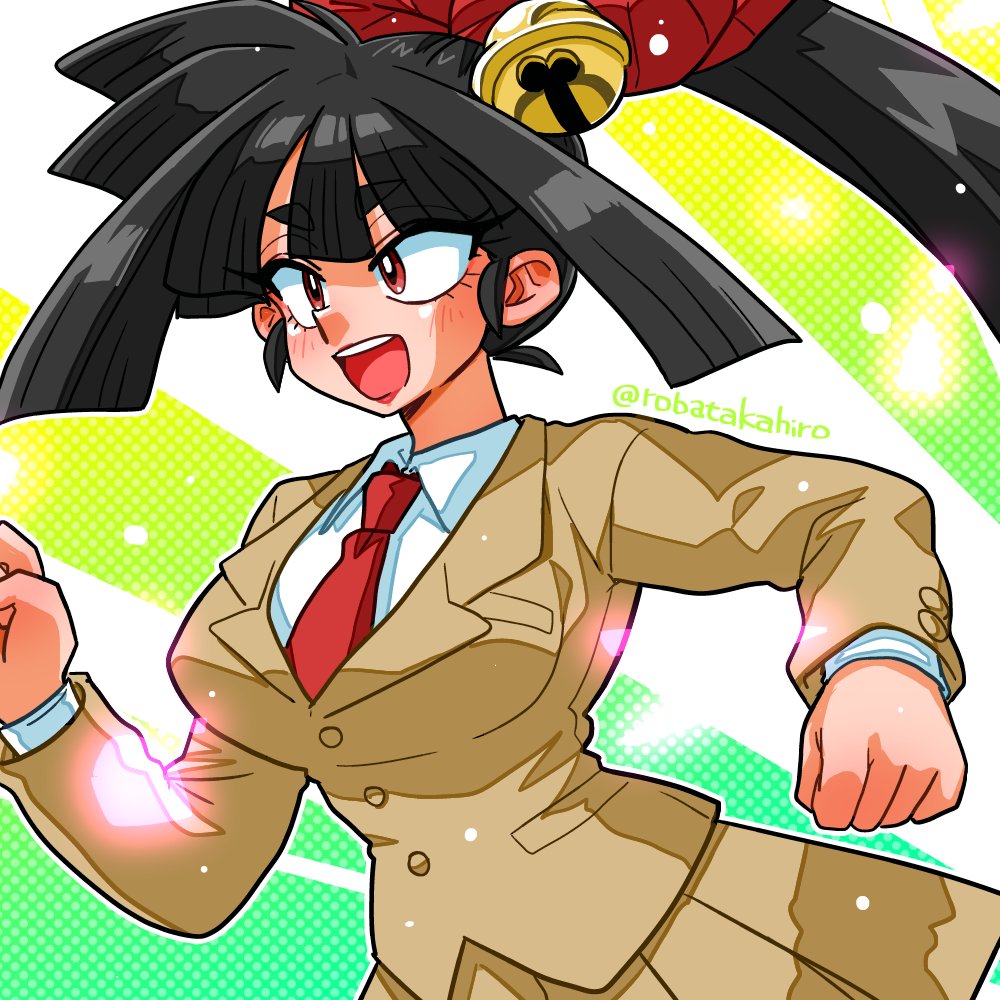 1girl artist_name bell black_hair brown_jacket brown_skirt hair_bell hair_ornament high_ponytail igami_ichika jacket jingle_bell long_hair looking_to_the_side necktie open_mouth ponytail red_necktie shirt skirt solo susume!_ashitabara_gakuen teeth upper_body upper_teeth_only wanta_(futoshi) white_shirt