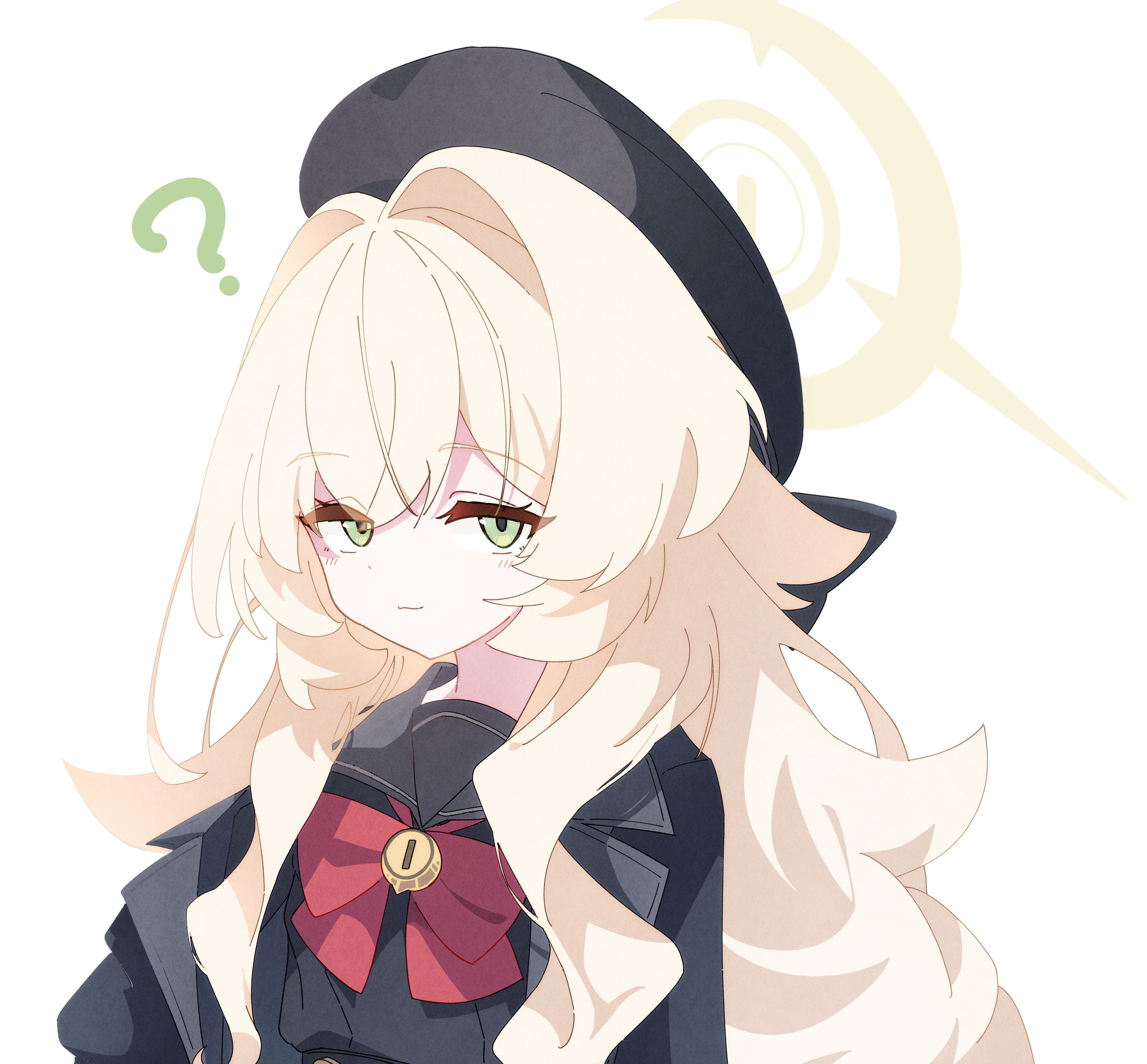 1girl ? absurdres beret black_coat black_hat black_sailor_collar black_serafuku black_shirt blonde_hair blue_archive blush closed_mouth coat commentary_request fluffy_hair green_eyes hair_between_eyes hat highres long_hair looking_at_viewer professor_niyaniya_(blue_archive) red_ribbon ribbon sailor_collar school_uniform serafuku shiratos_nas shirt sidelocks simple_background upper_body very_long_hair white_background