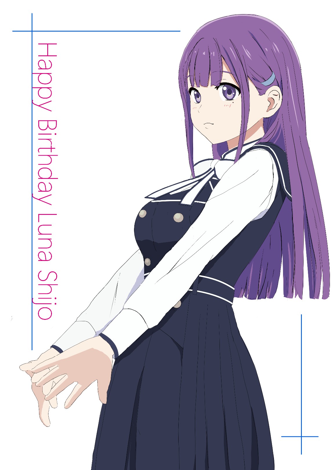 1girl 22/7 belt black_belt black_dress blush buttons center-flap_bangs character_name closed_mouth cowboy_shot double-breasted dress fanged_bangs from_side hair_ornament happy_birthday highres ichinose_hotaru long_hair long_sleeves mole mole_under_eye neck_ribbon pinafore_dress purple_eyes purple_hair ribbon shirt shirt_under_dress sleeveless sleeveless_dress solo standing tetu_rou white_background white_ribbon white_shirt