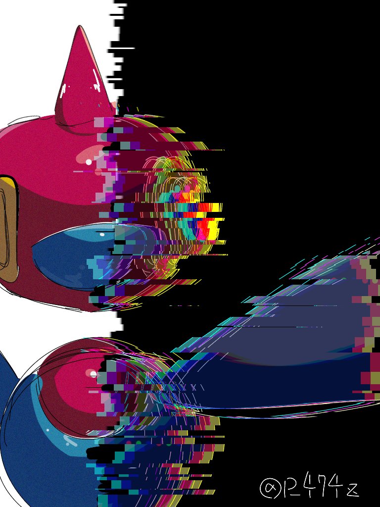commentary gen_4_pokemon glitch horns nintendo no_humans outstretched_arm p_474z pokemon pokemon_(creature) pokemon_focus porygon-z single_horn straight-on twitter_username yellow_eyes
