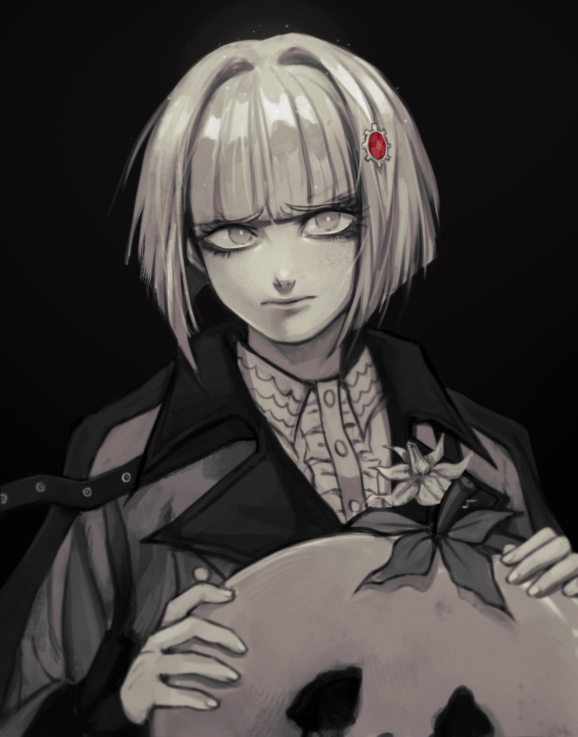 1girl absurdres anaizzzen bright_pupils frown gem hair_intakes hair_ornament hands_up highres holding holding_mask jacket looking_at_viewer mask oosuzuki_kurara red_gem shirt short_hair solo spot_color the_hundred_line_-last_defense_academy- unworn_mask upper_body