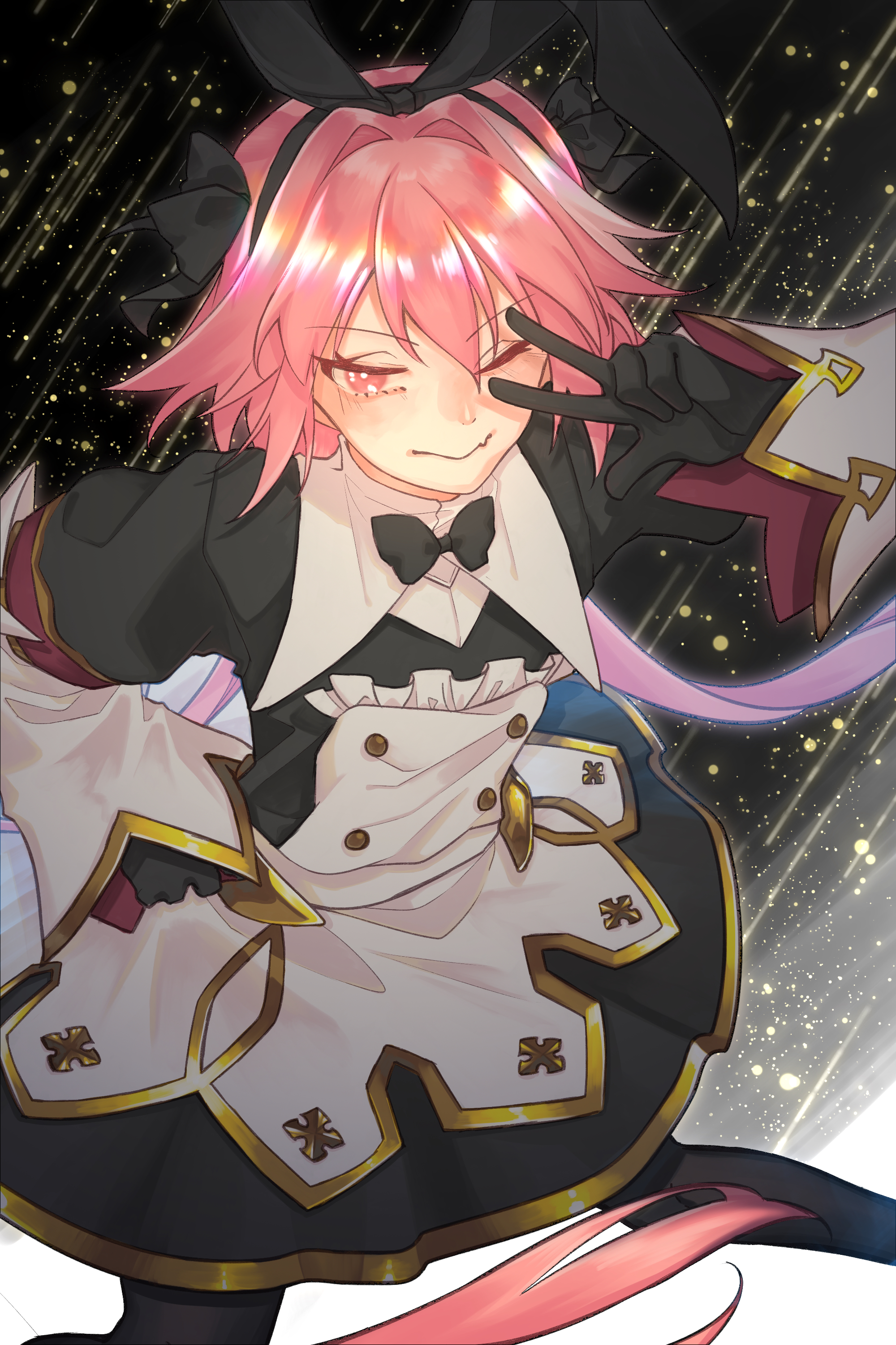 1boy absurdres astolfo_(fate) astolfo_(saber)_(fate) astolfo_(saber)_(third_ascension)_(fate) black_background black_bow black_gloves bow crossdressing crossdressing_(mtf) fate/apocrypha fate/grand_order fate_(series) gloves gradient_background hair_bow hair_intakes hand_on_own_hip highres male_focus multicolored_hair multiple_hair_bows nekokitsune4242 one_eye_closed pink_eyes pink_hair streaked_hair trap v white_hair