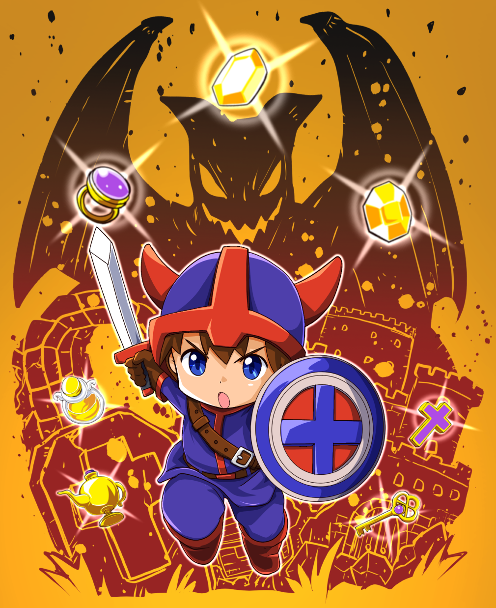 1boy arm_up blue_eyes blue_helmet blue_pants blue_tunic brown_gloves castle chibi chibi_only coffin cross fake_horns gem gloves helmet highres holding holding_sword holding_weapon horned_helmet horns hydlide jewelry jim_(hydlide) key knight male_focus oil_lamp open_mouth pants ring sakurajyousui_nami solo sword tunic weapon yellow_gem