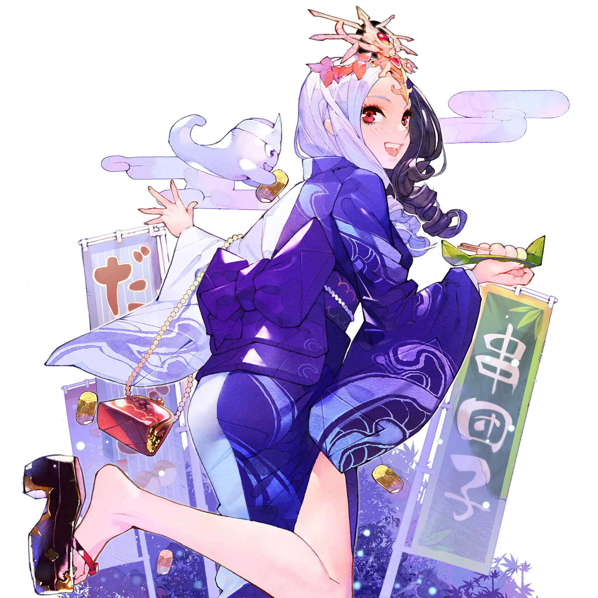 1girl :d ass barefoot black_hair blush bottle bow curly_hair drill_hair fang fish floral_print food from_behind full_body hair_ornament high_heel_sandals high_heels highres holding isaac_hein_iii izanami_(uchihime) japanese_clothes kimono leg_lift long_hair long_sleeves looking_at_viewer looking_back mole multicolored_hair non-web_source open_mouth purple_hair red_eyes sandals sash smile soles solo tail transparent_background two-tone_hair uchi_no_hime-sama_ga_ichiban_kawaii wavy_hair white_hair wide_sleeves yukata