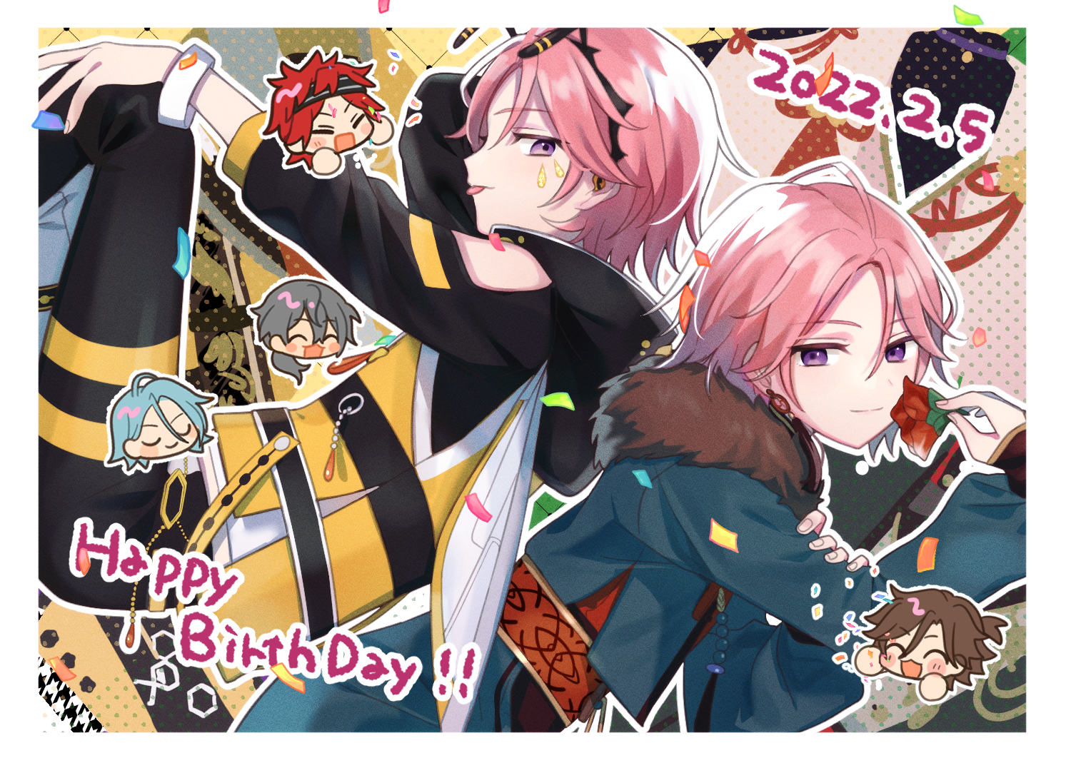 5boys amagi_rinne blue_jacket border closed_mouth clothing_cutout confetti ensemble_stars! flower fur-trimmed_jacket fur_trim hand_on_own_knee happy_birthday himeru_(ensemble_stars!) holding holding_flower jacket long_legs looking_at_viewer looking_back mikejima_madara multiple_boys multiple_views official_alternate_costume oukawa_kohaku pink_hair purple_eyes shiina_niki shisokonbu shoulder_cutout smile tongue white_border