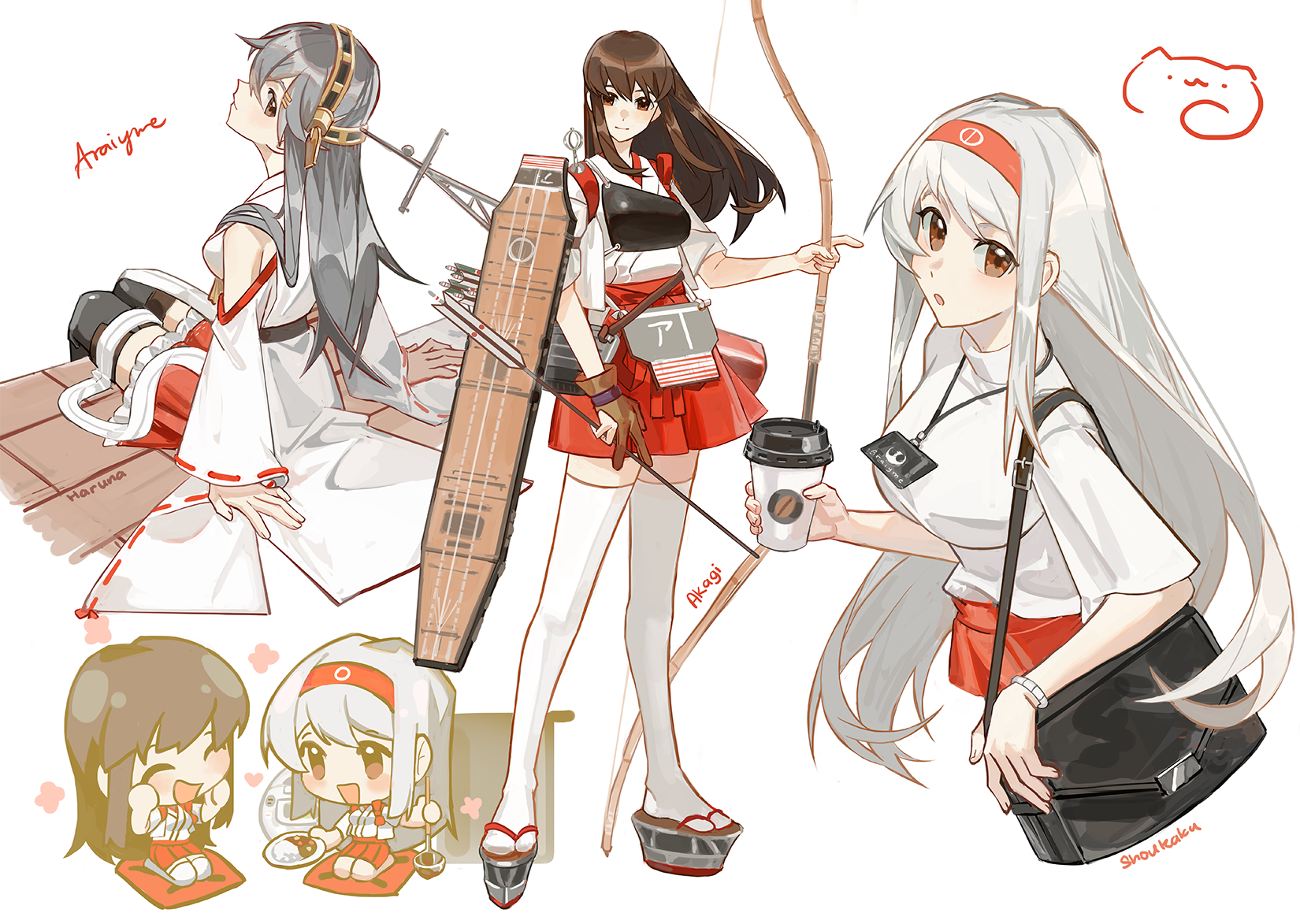 3girls akagi_(kancolle) araiyme arrow_(projectile) bag bow_(weapon) breasts brown_eyes brown_hair character_name chibi closed_eyes closed_mouth commentary cup curry disposable_cup english_commentary flight_deck food frilled_skirt frills gloves grey_hair hakama hakama_skirt haruna_(kancolle) headband headgear heart highres holding holding_cup holding_weapon japanese_clothes kantai_collection large_breasts long_hair medium_breasts multiple_girls multiple_views muneate nontraditional_miko parted_lips partially_fingerless_gloves partly_fingerless_gloves quiver red_hakama red_headband red_skirt rigging shoukaku_(jal)_(kancolle) shoukaku_(kancolle) signature simple_background sitting skirt standing tasuki thighhighs very_long_hair weapon white_background white_hair white_thighhighs yugake