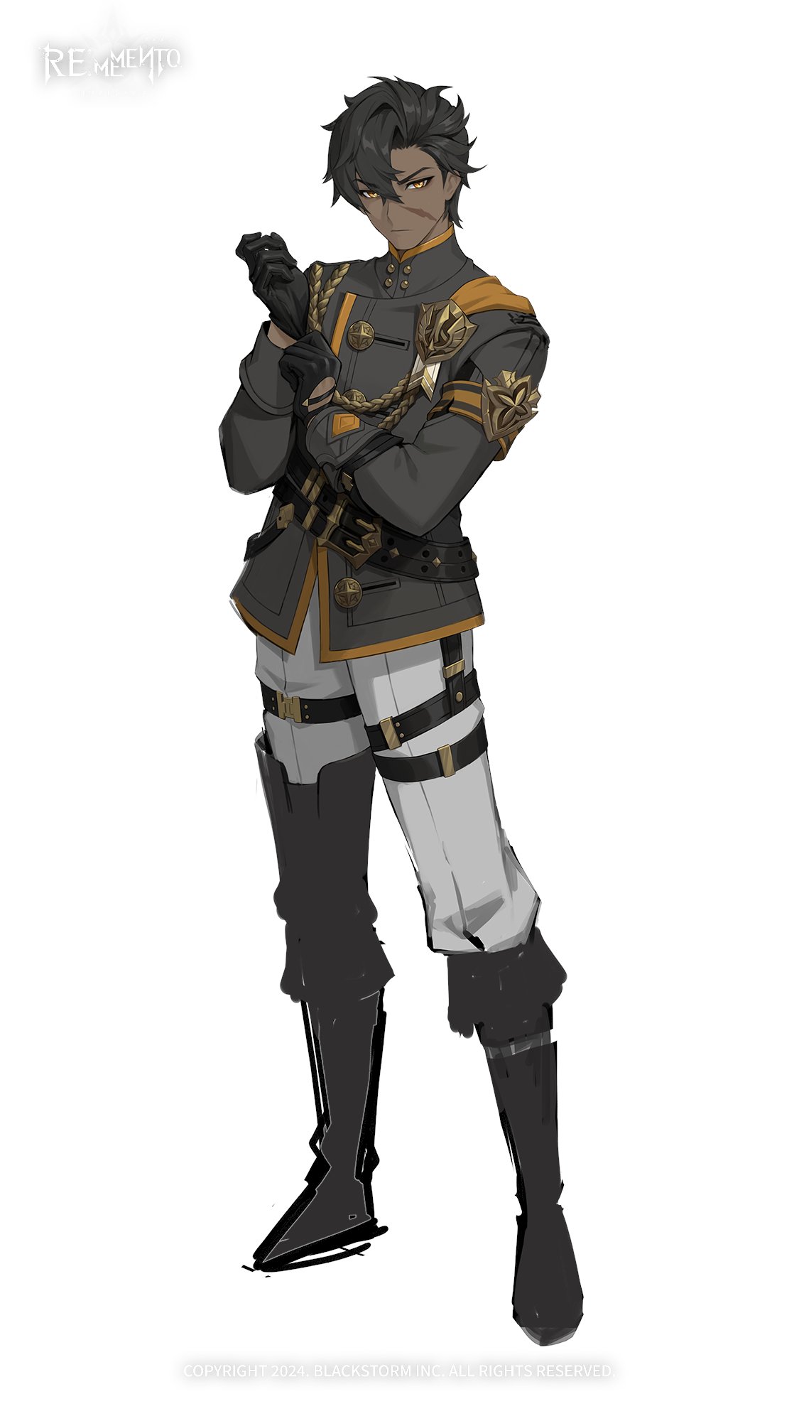 1boy adjusting_clothes adjusting_gloves black_boots black_gloves black_hair boots copyright_name copyright_notice dark-skinned_male dark_skin full_body glove_pull gloves grey_jacket hands_up highres jacket legs_apart logo looking_at_viewer male_focus official_art pants rememento:_white_shadow scar scar_on_face short_hair single_thigh_boot solo standing tachi-e theodore_(rememento) thigh_boots unworn_boots white_background white_pants yellow_eyes