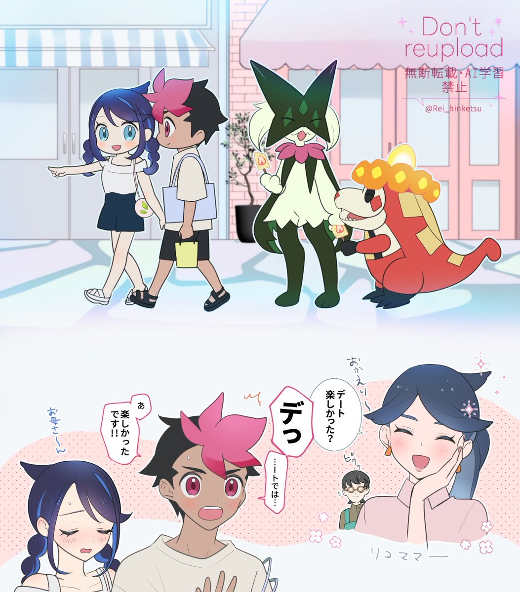 2boys 2girls alex_(pokemon) bag black_shoes black_shorts building chibi closed_eyes commentary_request crocalor earrings eyelashes hand_up highres jewelry liko_(pokemon) lucca_(pokemon) meowscarada multicolored_hair multiple_boys multiple_girls nintendo open_mouth pink_hair plant pointing pokemon pokemon_(anime) pokemon_horizons rei_hinketsu roy_(pokemon) shirt shoes shopping_bag short_hair shorts speech_bubble standing translation_request twitter_username two-tone_hair watermark white_shirt white_shoes