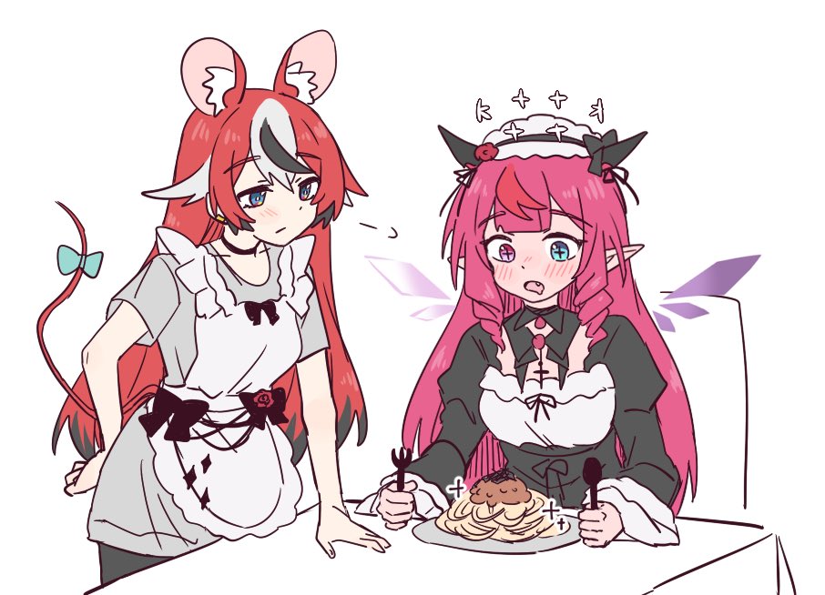 alternate_costume animal_ears black_hair blue_eyes blunt_bangs blush drill_hair enmaided food fork frills hakos_baelz heterochromia hololive hololive_english horns irys_(hololive) irys_(maid)_(hololive) juliet_sleeves long_hair long_sleeves maid mouse_ears mouse_girl mouse_tail multicolored_hair multiple_girls official_alternate_costume official_alternate_hairstyle open_mouth pasta pointy_ears puffy_sleeves purple_eyes purple_hair ramphastostella red_hair spaghetti spoon streaked_hair tail virtual_youtuber white_hair wings