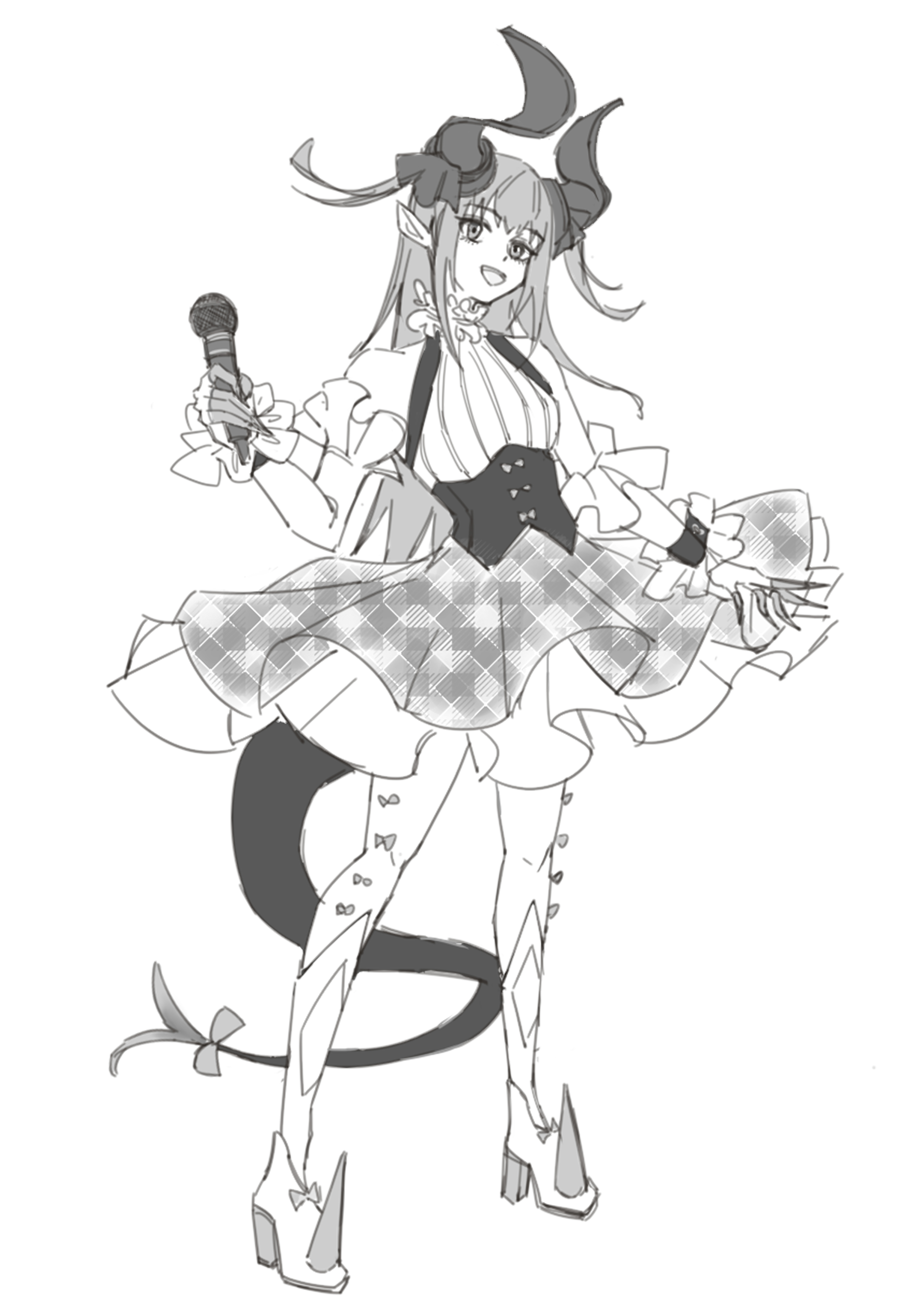 1girl absurdres bodice bow bowtie dress elizabeth_bathory_(fate) fate/grand_order fate_(series) frills hair_bow high_heels highres holding holding_microphone horns just_we layered_dress long_hair microphone original pleated_dress shoes solo solo_focus spiked_shoes spikes studs tail thighhighs