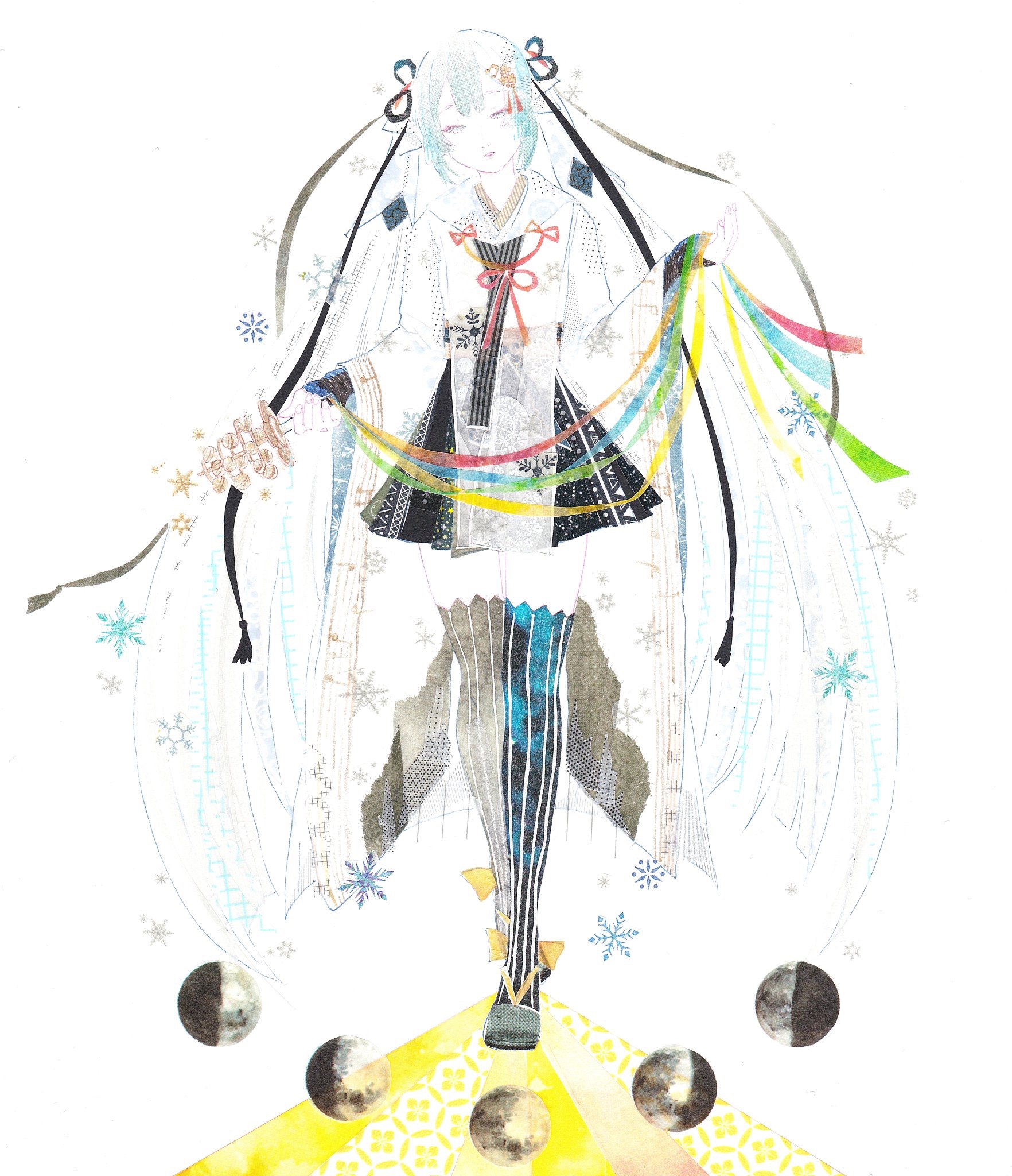 1girl aqua_ribbon bell black_ribbon black_shoes black_skirt black_sleeves black_thighhighs bow chihaya_(clothing) footwear_bow green_ribbon grey_eyes grey_hair hair_ribbon half-closed_eyes hand_up hatsune_miku highres holding holding_instrument holding_ribbon instrument jingle_bell kagura_suzu layered_sleeves long_hair masking_tape_(medium) mixed_media moon nostrils oikoko_koko parted_lips red_ribbon ribbon shoes sidelocks skirt sleeves_past_wrists snowflakes solo standing striped_clothes striped_thighhighs thighhighs thighs traditional_media twintails unconventional_media vertical-striped_clothes vertical-striped_thighhighs very_long_hair vocaloid white_background white_hair white_ribbon wide_sleeves yellow_bow yellow_ribbon yuki_miku yuki_miku_(2018) zettai_ryouiki