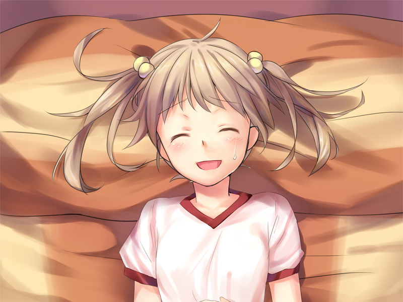 1girl artist_request blonde_hair blush closed_eyes game_cg hair_bobbles hair_ornament ibarazaki_emi katawa_shoujo medium_hair non-web_source official_art open_mouth shirt short_sleeves smile solo twintails variant_set white_shirt