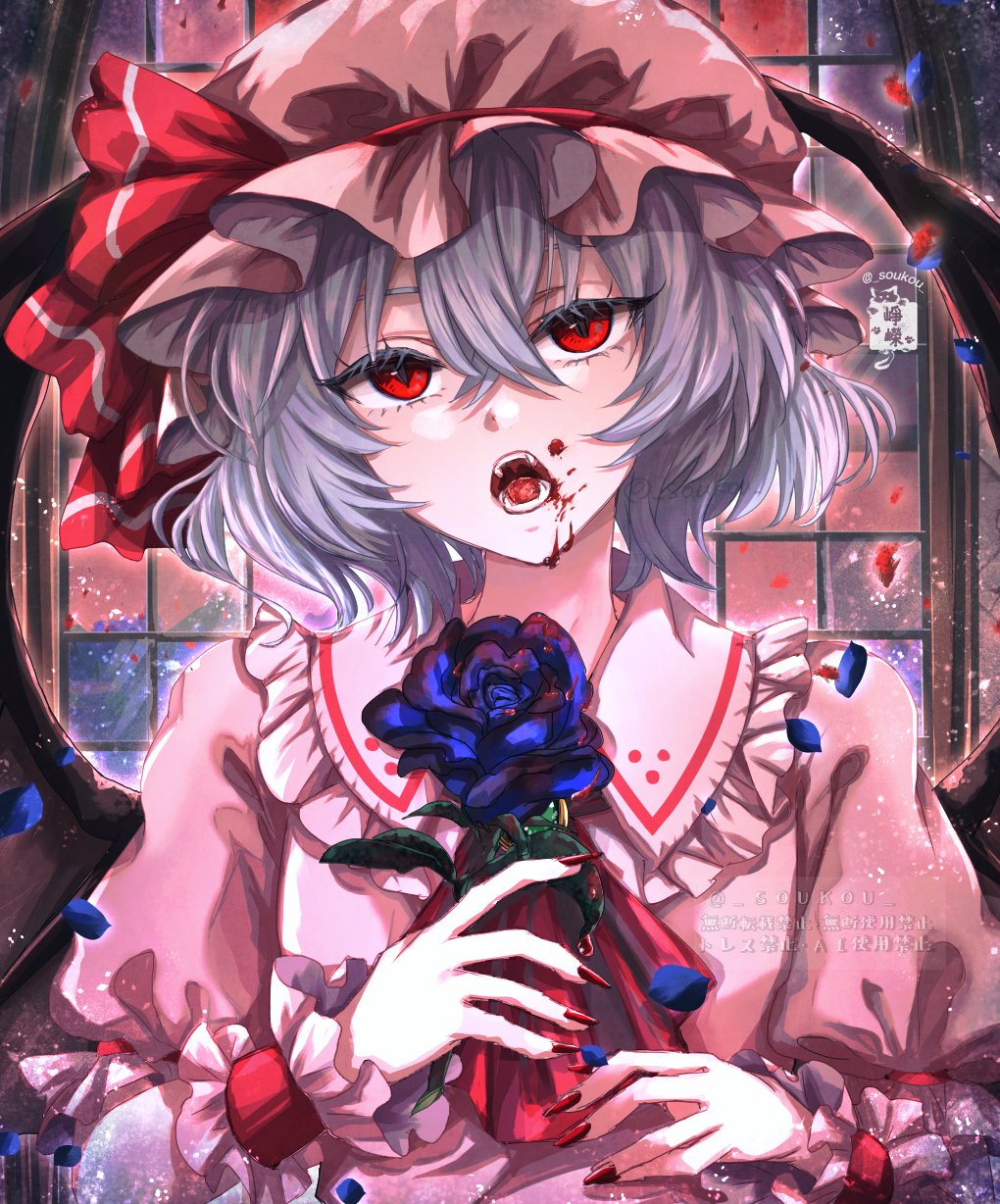 1girl ascot bat_wings blood blood_on_face blue_flower blue_hair blue_rose brooch collared_shirt commentary_request fangs fingernails flower frilled_shirt_collar frills hair_between_eyes hat hat_ribbon highres holding holding_flower indoors jewelry long_fingernails mob_cap open_mouth pink_hat pink_shirt puffy_short_sleeves puffy_sleeves red_ascot red_eyes red_nails red_ribbon remilia_scarlet ribbon rose shirt short_hair short_sleeves solo soukou_(sankayou) touhou twitter_username upper_body window wings wrist_cuffs