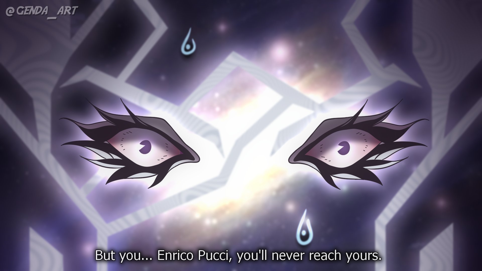 1boy bloodshot_eyes close-up colored_eyelashes english_text enrico_pucci fake_screenshot genda_art highres jojo_no_kimyou_na_bouken long_eyelashes male_focus purple_eyes solo stone_ocean subtitled sweat twitter_username white_eyelashes wide-eyed