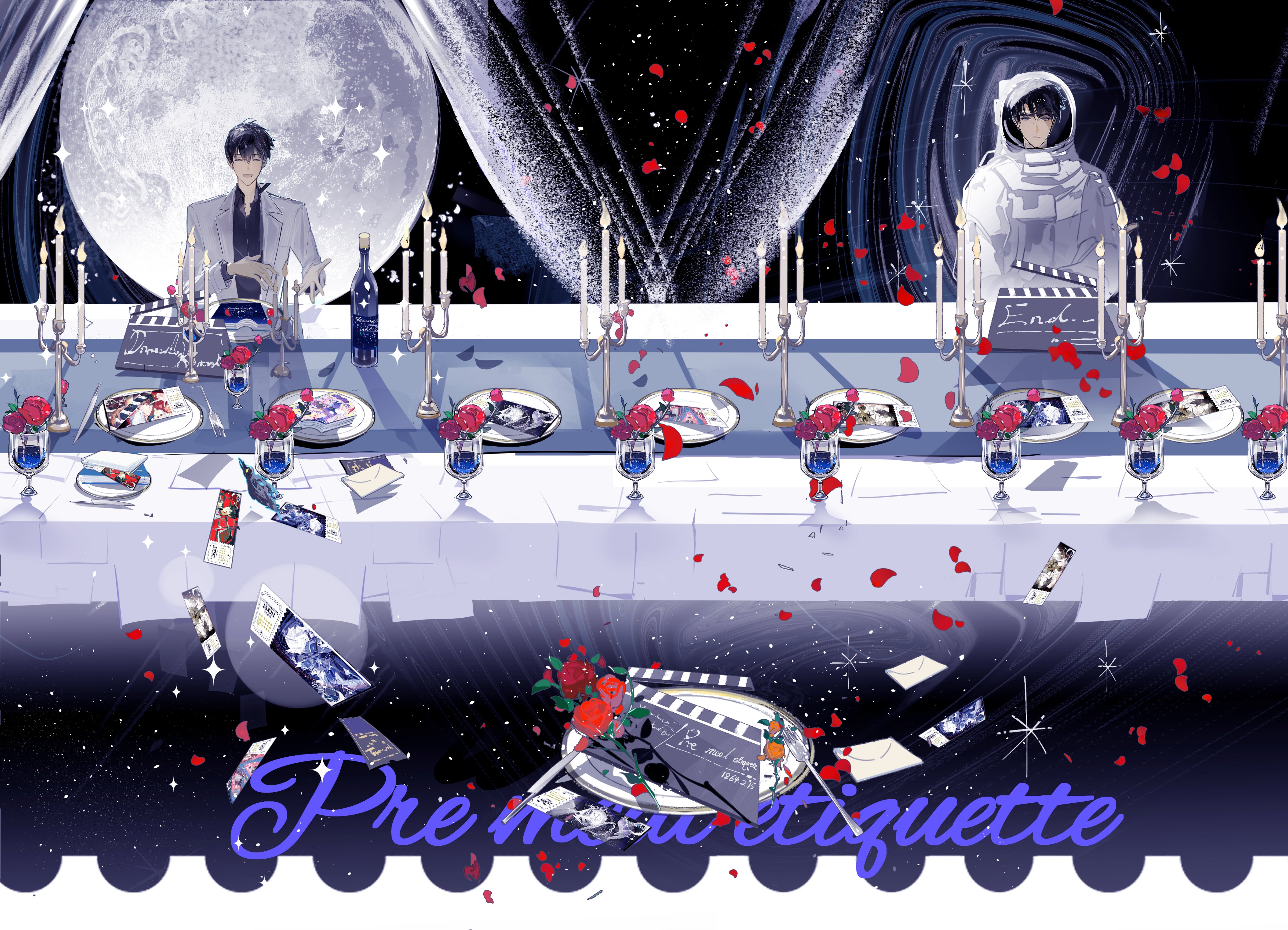 2boys absurdres alcohol astronaut banquet black_hair blue_liquid candlestand clapperboard closed_eyes cup curtains cutlery drinking_glass english_text envelope falling_petals flower full_moon glass_bottle grin hair_between_eyes hand_on_own_stomach helmet highres kim_dokja lantercat moon multiple_boys omniscient_reader's_viewpoint outstretched_hand petals photo_(object) planet plate red_flower red_rose reflective_surface rose sky smile space space_helmet spacesuit sparkle star_(sky) starry_sky tablecloth too_many_papers upper_body wine_glass yoo_joonghyuk