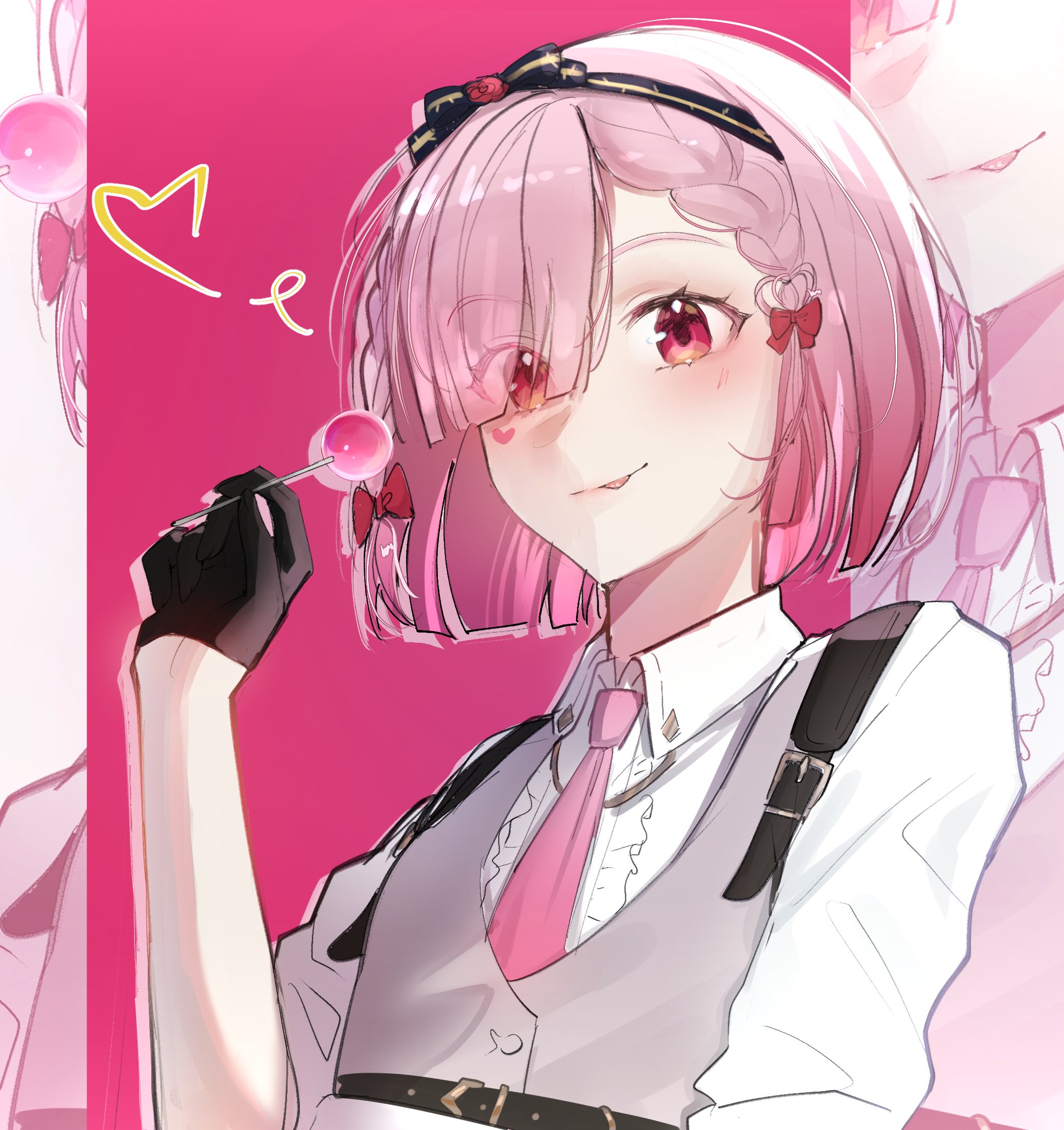 1girl black_gloves black_hairband bow braid candy chest_harness closed_mouth collared_shirt commentary english_commentary food frilled_shirt frills gloves gradient_eyes gradient_hair grey_vest hair_bow hairband half_gloves harness heart heart_sticker highres holding holding_candy holding_food holding_lollipop lollipop looking_at_viewer multicolored_eyes multicolored_hair nijisanji nijisanji_en o0114 orange_eyes pink_background pink_eyes pink_hair rosemi_lovelock rosemi_lovelock_(spy) shirt short_hair smile solo spoken_heart sticker sticker_on_face tongue tongue_out twin_braids upper_body vest virtual_youtuber white_shirt zoom_layer