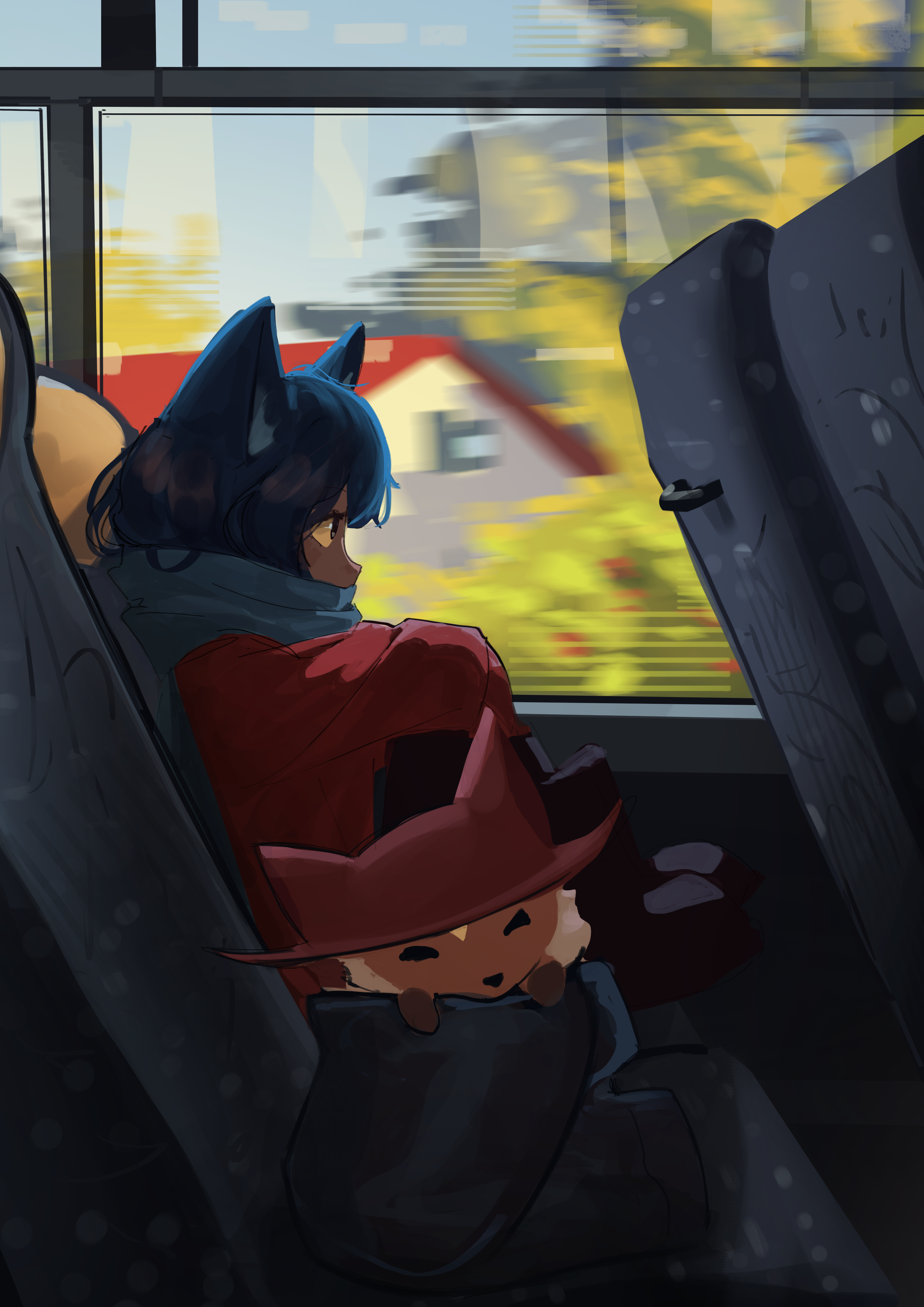 1girl 1other absurdres androgynous animal_ear_headwear animal_ears animal_hat blue_hair blue_scarf blurry blurry_background brown_poncho brown_tunic bus_interior cat_ears cat_hat child colored_sclera commentary english_commentary fake_animal_ears fox hat highres long_sleeves looking_to_the_side neck_fur niko_(oneshot) missing_headwear oneshot_(game) orange_fur rue_(oneshot) scarf shadches72 short_hair tunic white_fur yellow_eyes yellow_sclera