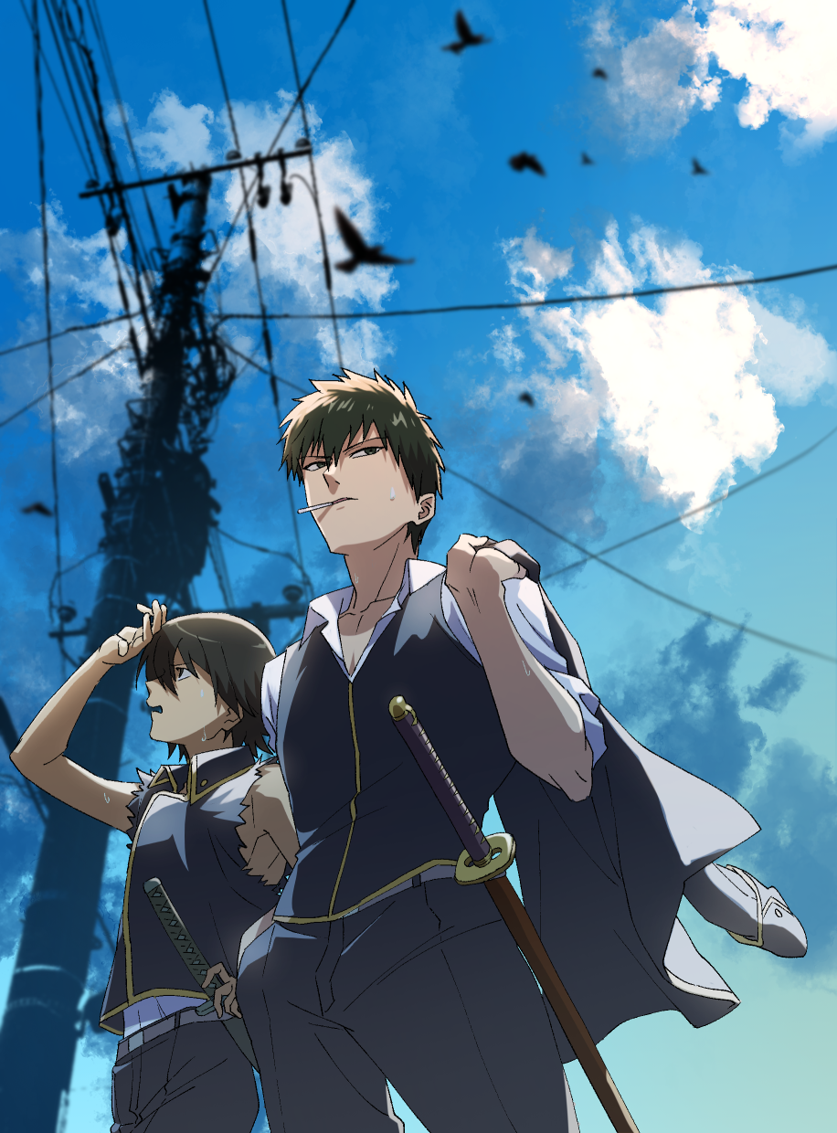 2boys bird black_eyes black_hair black_jacket black_pants black_vest blue_sky brown_hair cigarette cloud collared_shirt commentary commentary_request day from_below gintama hand_in_pocket highres hijikata_toushirou holding holding_jacket holding_sword holding_unworn_clothes holding_weapon jacket katana looking_afar looking_up male_focus mouth_hold multiple_boys outdoors pants power_lines scabbard shading_eyes sheath sheathed shinsengumi_(gintama) shirt short_hair sky sleeveless sleeveless_jacket smoking sword torn_clothes torn_shirt torn_sleeves unworn_jacket user_xcmk4578 utility_pole vest weapon white_shirt yamazaki_sagaru