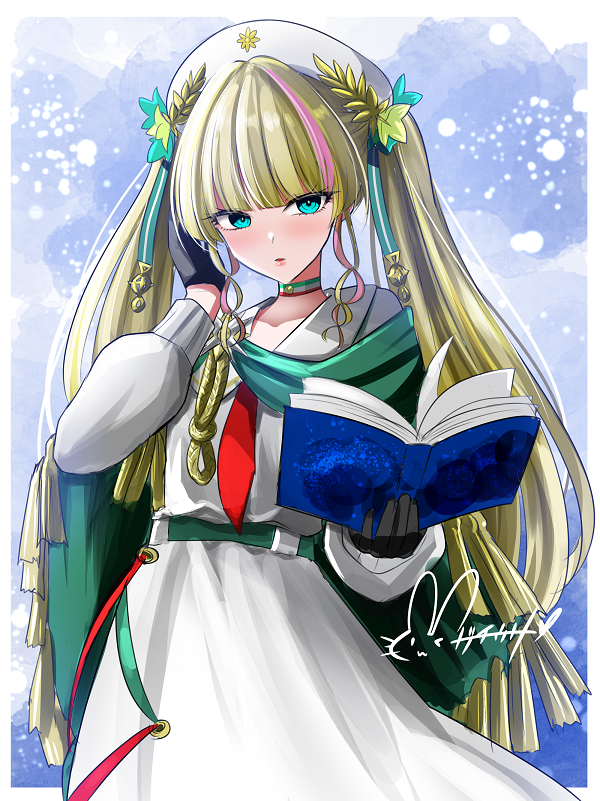 1girl azur_lane belt beret black_gloves blonde_hair blue_eyes blunt_bangs blush book choker dress giosue_carducci_(azur_lane) gloves hair_ornament hat hisin holding holding_book long_hair long_sleeves looking_at_viewer multicolored_hair necktie open_book parted_lips pink_hair red_necktie signature solo streaked_hair twintails white_dress
