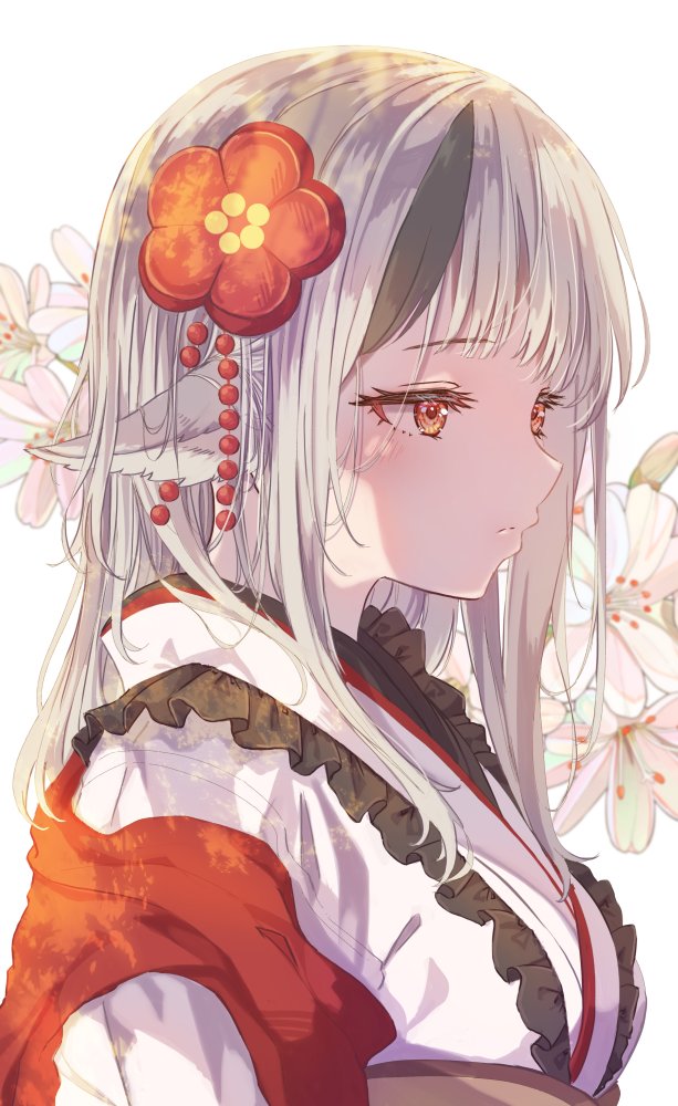 1girl animal_ears breasts closed_mouth eyelashes fire_emblem fire_emblem_fates fire_emblem_heroes flower frilled_kimono frills frown fuussu_(21-kazin) grey_hair hair_flower hair_ornament japanese_clothes kimono medium_breasts multicolored_hair nintendo official_alternate_costume orange_eyes solo streaked_hair two-tone_hair two-tone_kimono velouria_(fire_emblem) velouria_(new_year)_(fire_emblem) wolf_ears wolf_girl