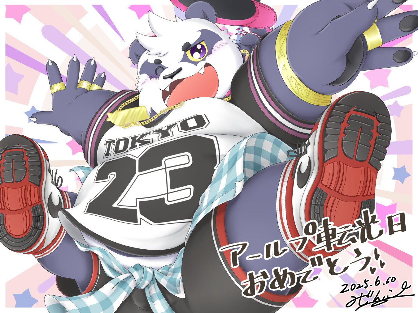 1boy alp_(housamo) animal_ears baseball_cap belly black_shorts blush clothes_around_waist commentary_request dated fangs fat fat_man furry furry_male gold_necklace hat heart jewelry looking_at_viewer mijinko_(ame_to_muchi) necklace one_eye_closed open_mouth panda_boy panda_ears purple_fur shirt shirt_around_waist shorts signature smile star_(symbol) tokyo_houkago_summoners translation_request white_fur white_shirt