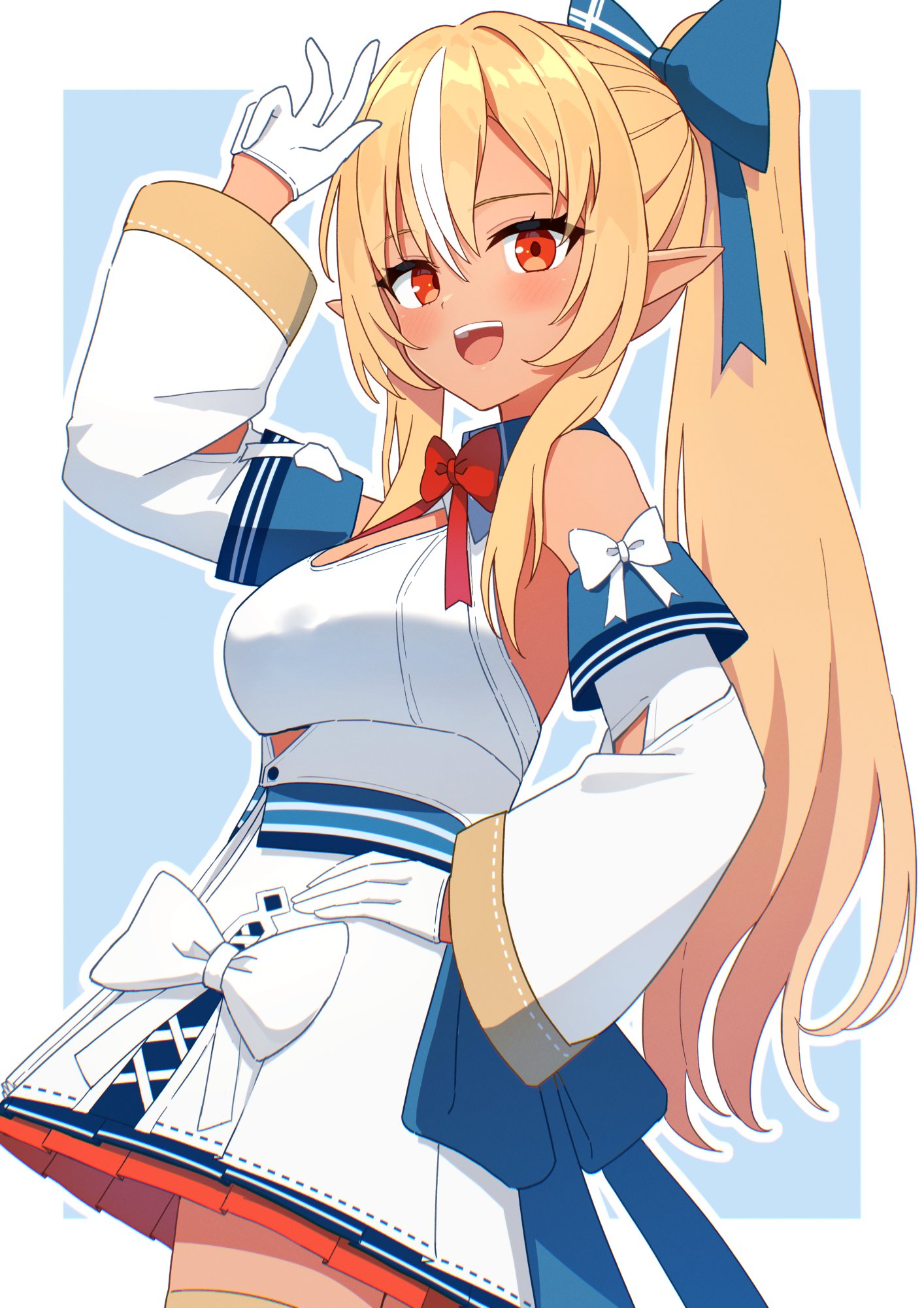 1girl blonde_hair blue_bow bow dark-skinned_female dark_elf dark_skin dress elbow_gloves elf gloves hair_bow hand_on_own_hip highres hololive kaie long_hair multicolored_hair open_mouth pointy_ears ponytail red_eyes shiranui_flare shiranui_flare_(1st_costume) smile solo two-tone_hair virtual_youtuber white_dress white_gloves white_hair white_sleeves