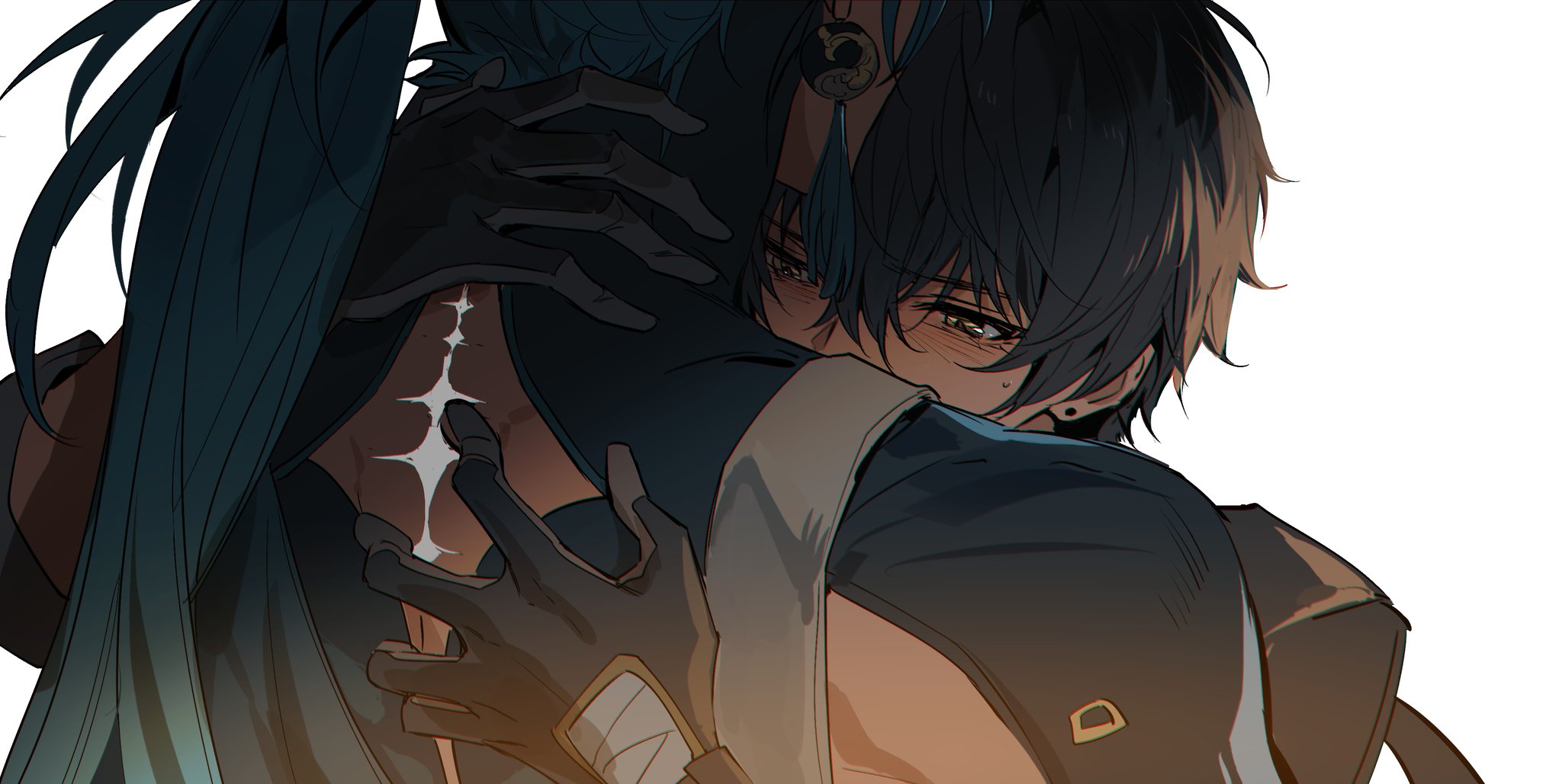 2boys back_cutout black_gloves black_hair blue_hair blush clothing_cutout commentary earrings gloves hair_between_eyes hand_on_another's_back hand_on_another's_neck hashtag-only_commentary highres hug jewelry jiyan_(wuthering_waves) long_hair male_focus male_rover_(wuthering_waves) multiple_boys piercing ponytail rover_(wuthering_waves) short_hair simple_background stud_earrings tacet_mark_(wuthering_waves) tassel tassel_earrings upper_body very_long_hair white_background xiandao1213 yaoi yellow_eyes