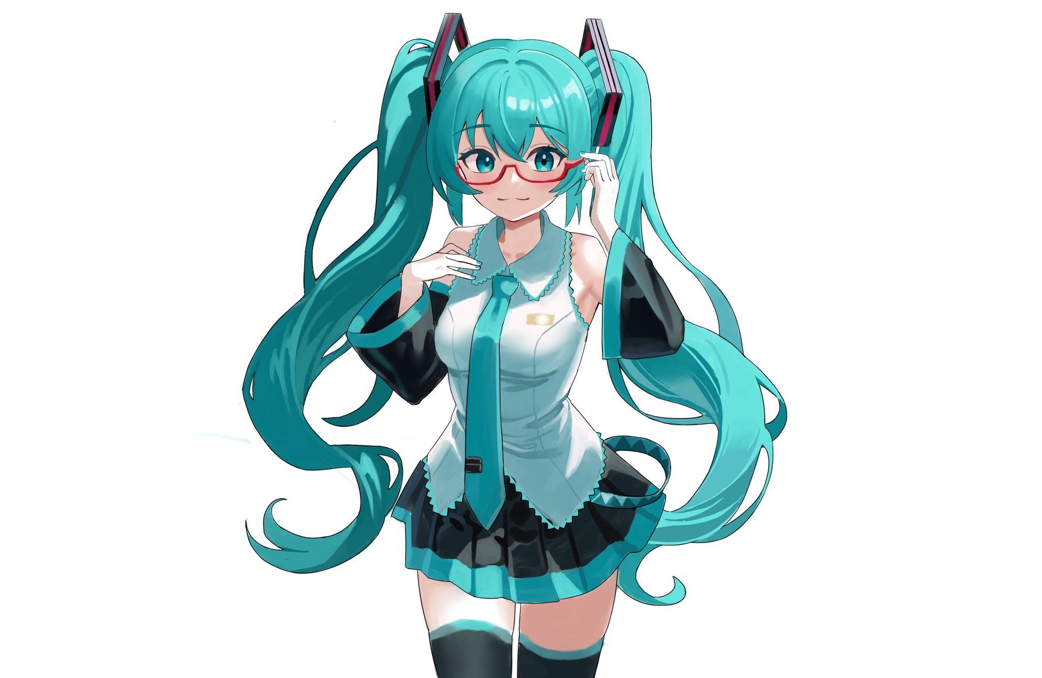 1girl adjusting_eyewear armpits bare_shoulders belt black_hair black_skirt black_thighhighs blue_belt blue_eyes blue_hair blue_nails blue_necktie blush collarbone collared_shirt commentary detached_sleeves fingernails glasses hand_up hashtag-only_commentary hatsune_miku highres kkyungkki long_hair looking_at_viewer necktie pleated_skirt shirt simple_background skirt smile solo thighhighs transparent_background twintails very_long_hair vocaloid white_shirt wing_collar zettai_ryouiki