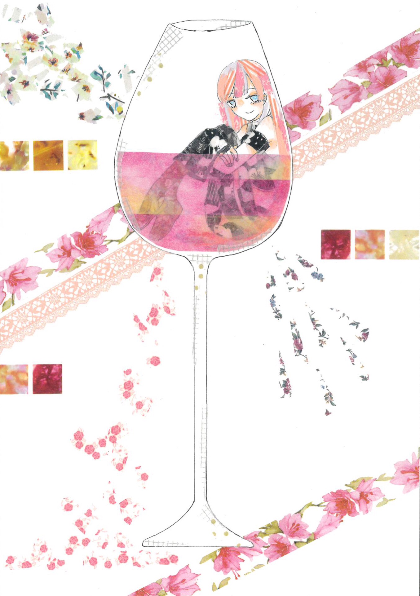 1girl 922pochan abstract armband bare_shoulders black_shirt black_skirt boots brown_boots commentary crop_top cup drinking_glass english_commentary highres hugging_own_legs knees_up long_hair looking_at_viewer masking_tape_(medium) megurine_luka mixed_media partially_submerged pink_eyes pink_hair pink_theme shirt sidelocks sitting skirt smile solo swept_bangs traditional_media unconventional_media vocaloid white_background wine_glass