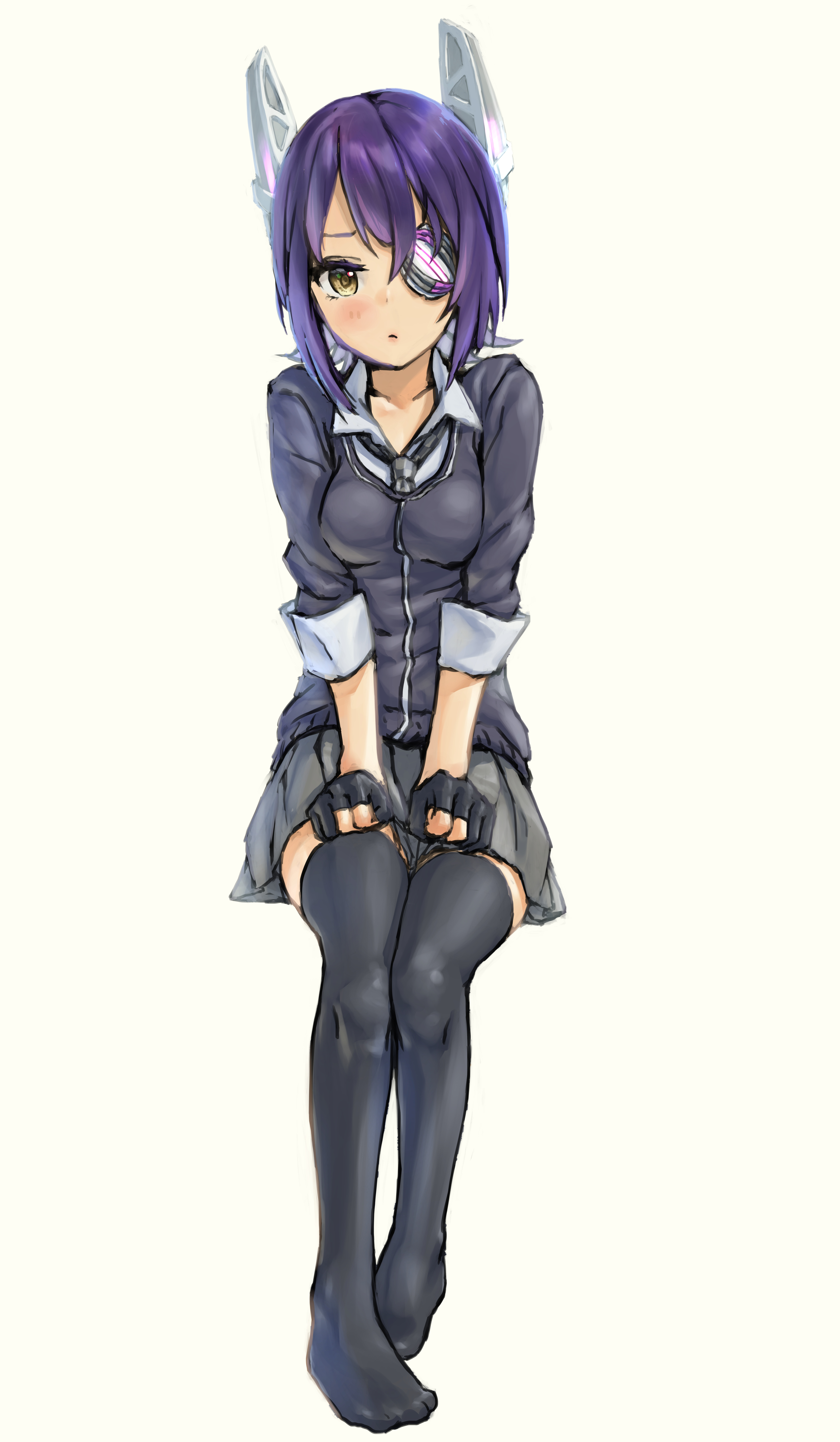 1girl absurdres black_cardigan black_gloves black_thighhighs blush breasts brown_eyes cardigan clenched_hands closed_mouth collared_shirt eyepatch gloves grey_skirt hair_between_eyes headgear highres invisible_chair kangoku_kou kantai_collection looking_at_viewer medium_breasts necktie partially_fingerless_gloves pleated_skirt purple_hair shirt short_hair simple_background sitting skirt solo tenryuu_(kancolle) thighhighs yellow_background yellow_eyes